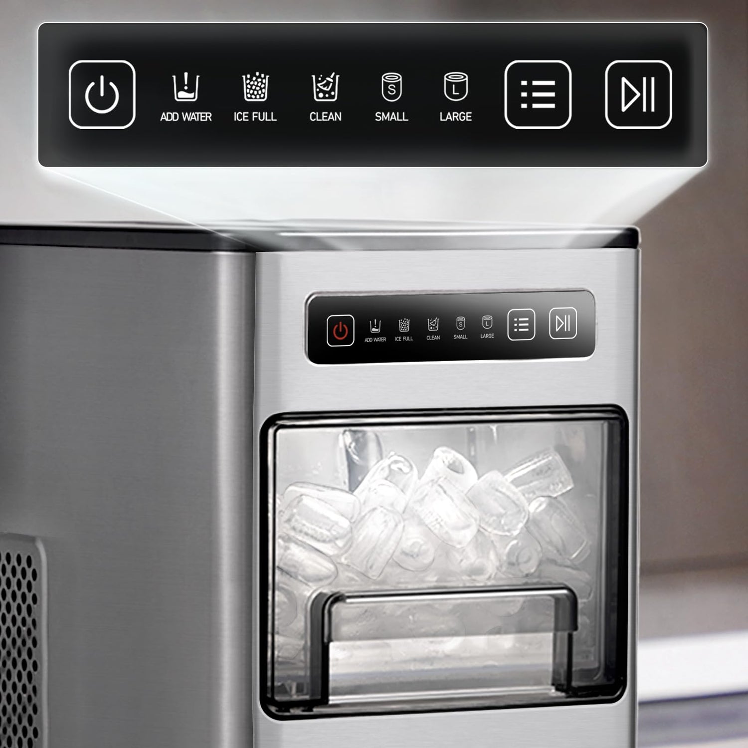 • Easy Controls, Clear Indicators: The intuitive control panel and clear indicators allow for effortless operation; power the machine on/off, start/pause ice making, switch the ambient light on/off, choose ice size, and activate the self-cleaning function with the press of a button.