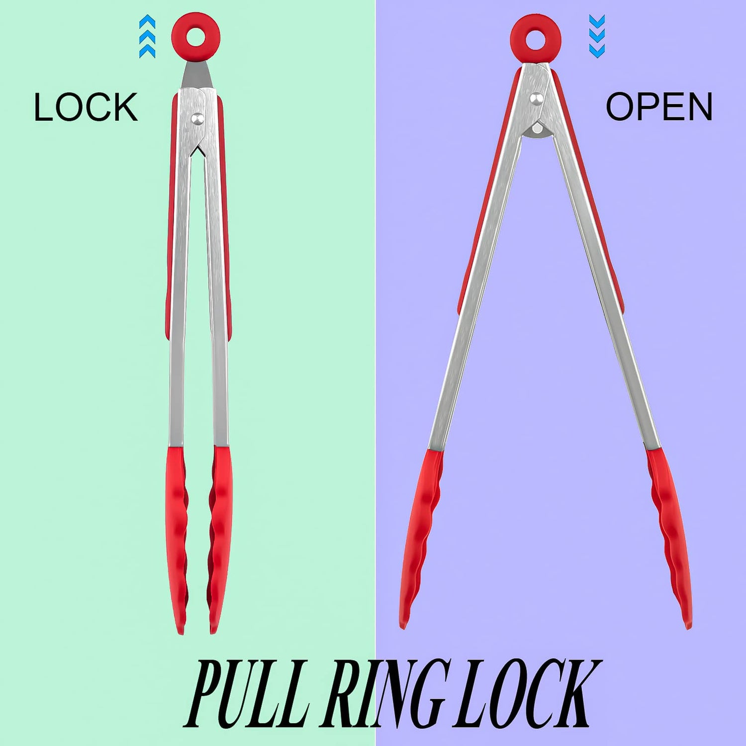 • EQUIPPED WITH A PULL-RING TECHNOLOGY: Our kitchen tongs are designed with a locking mechanism. The pull ring technology will keep your tongs from opening and closing. Simply pull the ring to lock and push to unlock.