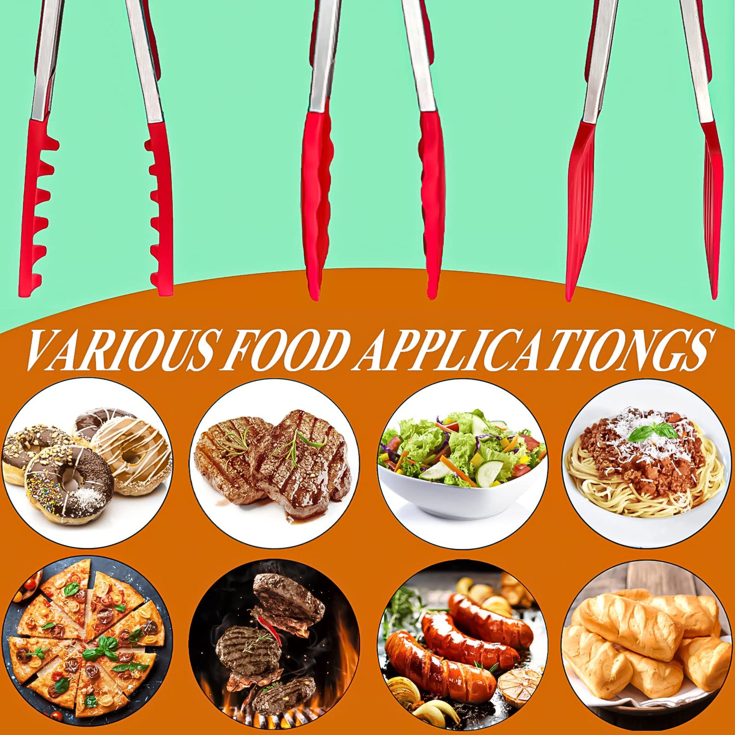 HST 3 Pack Kitchen Tongs, Non Stick Stainless Steel 9 Inch Tongs With Silicone Tip for Cooking BBQ Baking(Red)