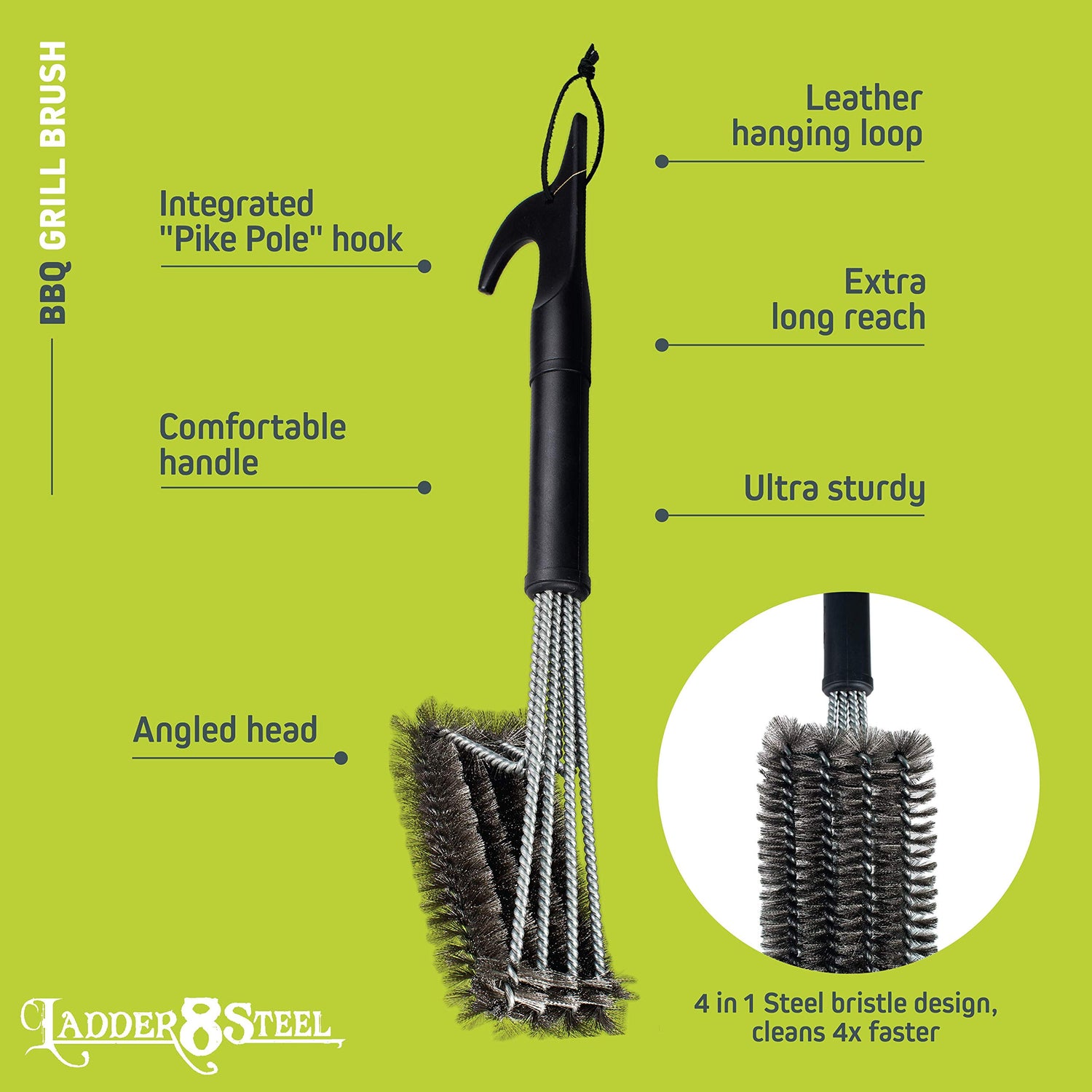 • HIGH-QUALITY, 4-IN-1 HEAVY DUTY BBQ BRUSH: Made with 4 stainless-steel brushes for cleaning any grate thoroughly and safely. Four rows clean faster than three and resist bending when you put some effort into it. The 18-inch-long extended handle is supported with braided steel that ensures a tough grill cleaning tool.