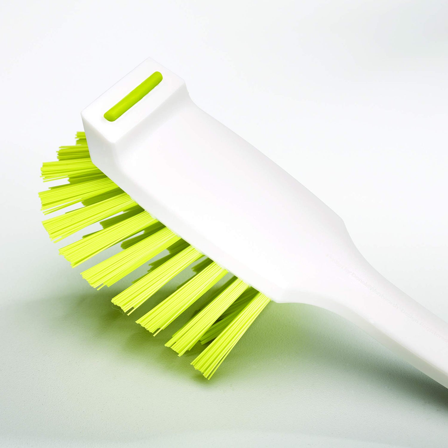 Details: This distinctive dish brush helps make full use of space around the sink by conveniently storing inside it. The design has a non-slip resting point that enables it to be stored on the inside edge of the sink, thereby saving space and allowing excess water and soap suds to drain neatly away. The non-scratch brush head is curved to help clean in the corners of trays and pans and has an integrated pan scraper for tough food deposits. Dishwasher safe.