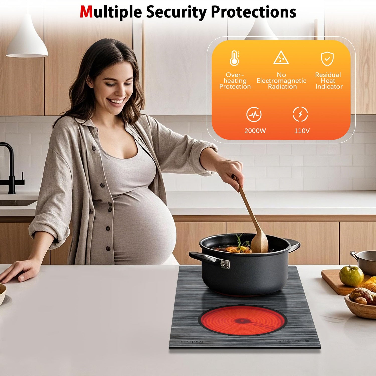 • 【Compatible with All Flat-bottomed Cookware】This 12" electric ceramic cooktop works with any heat-resistant, flat-bottomed cookware—whether it’s iron, aluminum, stainless steel, or glass. The high-quality glass surface is heat-resistant, scratch-resistant, and easy to clean. Plus, a free cleaning tool is included for added convenience!