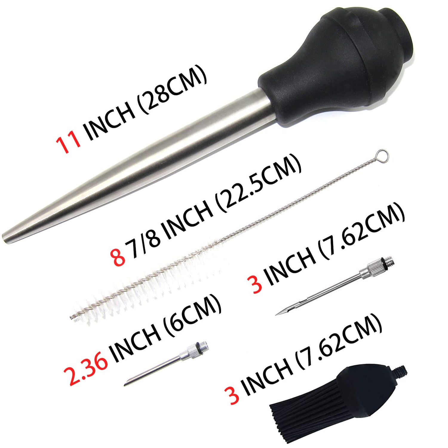 • Stainless steel injector needle and silicone basting brush included. Clean-up is easy with the included brush