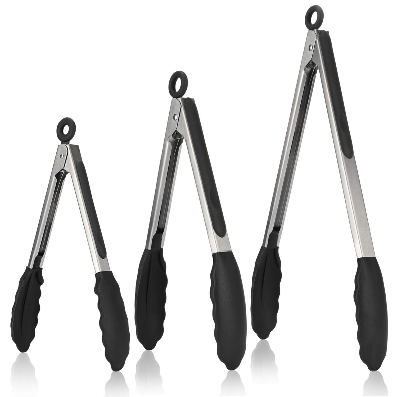 Kitchen Tongs, U-Taste 7/9/12 inches Cooking Tongs, with 600ºF High Heat-Resistant Non-Stick Silicone Tips, 18/8 Stainless Steel Handle, for Food Grill, Salad, BBQ, Frying, Serving, Pack of 3(Black)