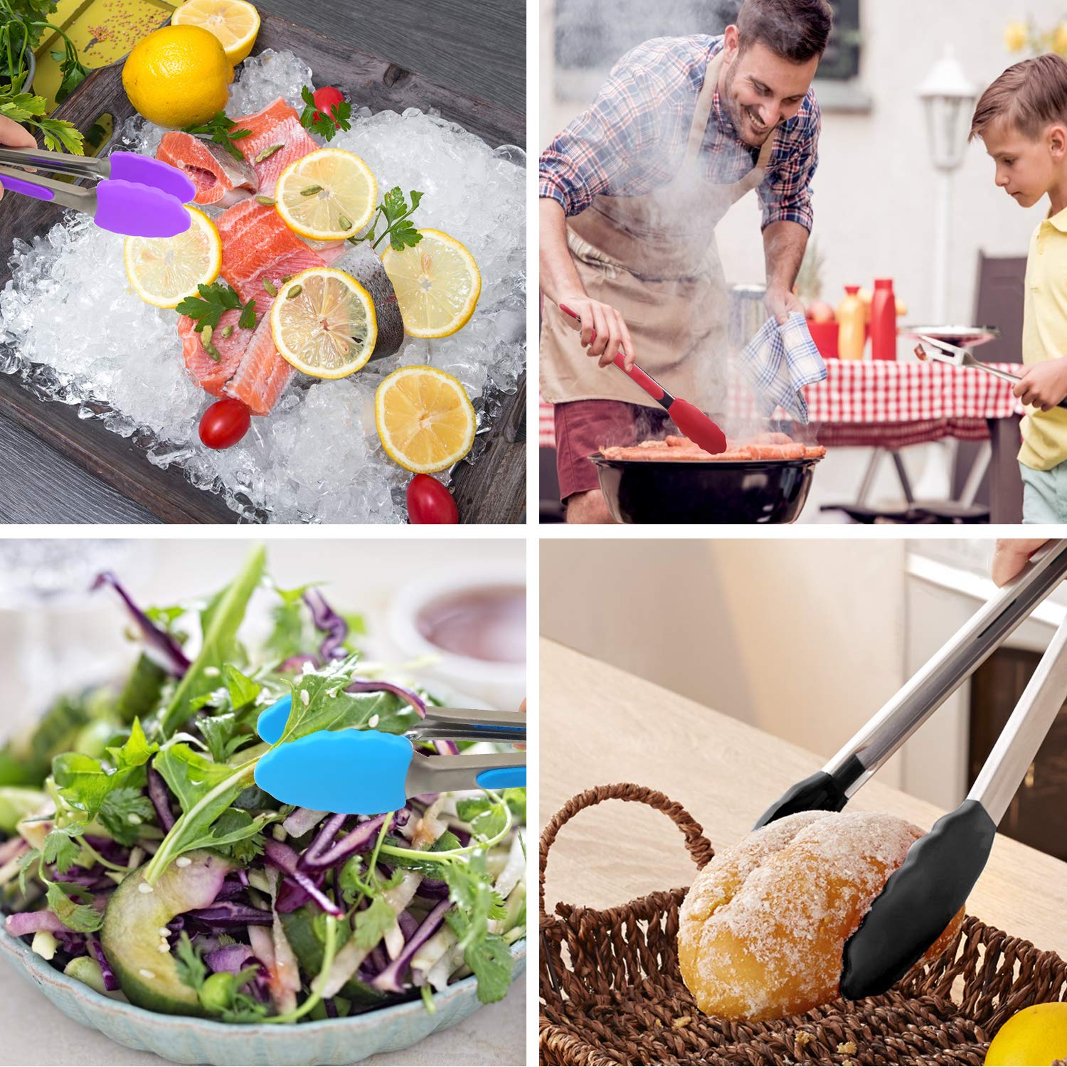 • 2 Sizes to Meet Your Different Needs: 9 inch long kitchen tongs for cooking can be used to cook pasta, potatoes, etc., 7 inch medium tongs can be used for indoor or outdoor grilling, suitable for bacon, salad, etc.