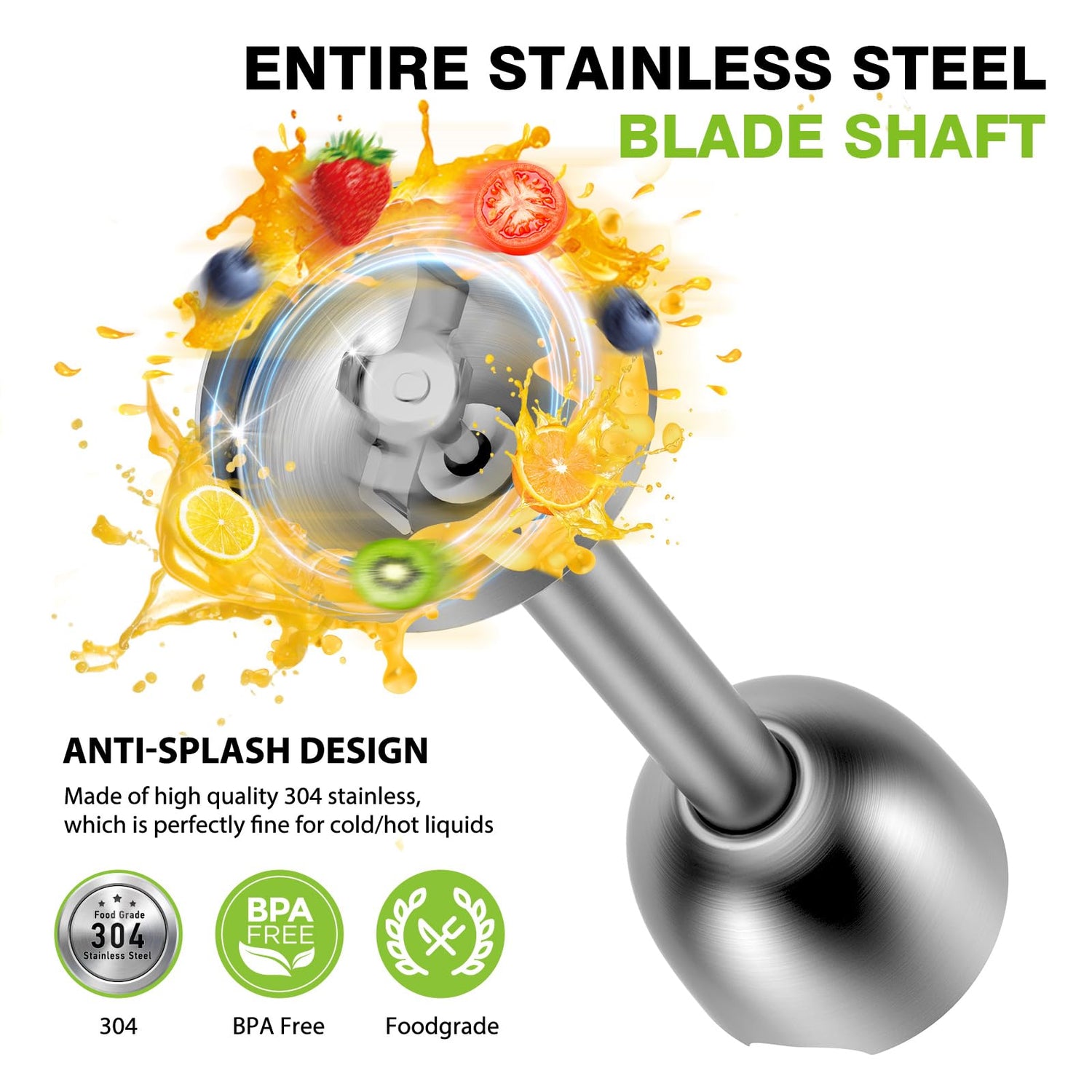 - Entire Stainless Steel Blender Shaft: The blender handheld built in stainless steel body sophisticated and scratch-resistant. Sturdy edible grade 304 stainless steel housing, is secure and safe when in contact with food. Non-slip rubber handles to be softer and easier to grip