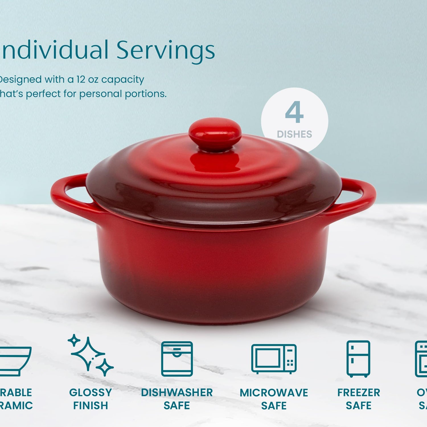 - Individual Servings: Designed with a 12 oz capacity that’s perfect for personal portions. Each dish is paired with a lid to keep contents warm until serving. They’re oven, dishwasher, microwave, and freezer safe for maximum convenience