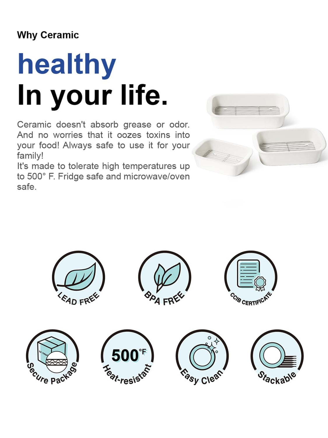 • High-Quality, Safe Ceramic: Made from durable, lead-free ceramic, this casserole dishes set is oven-safe up to 500°F and is also microwave, dishwasher, and freezer safe. Non-stick ceramic and rounded corners make cleaning easier