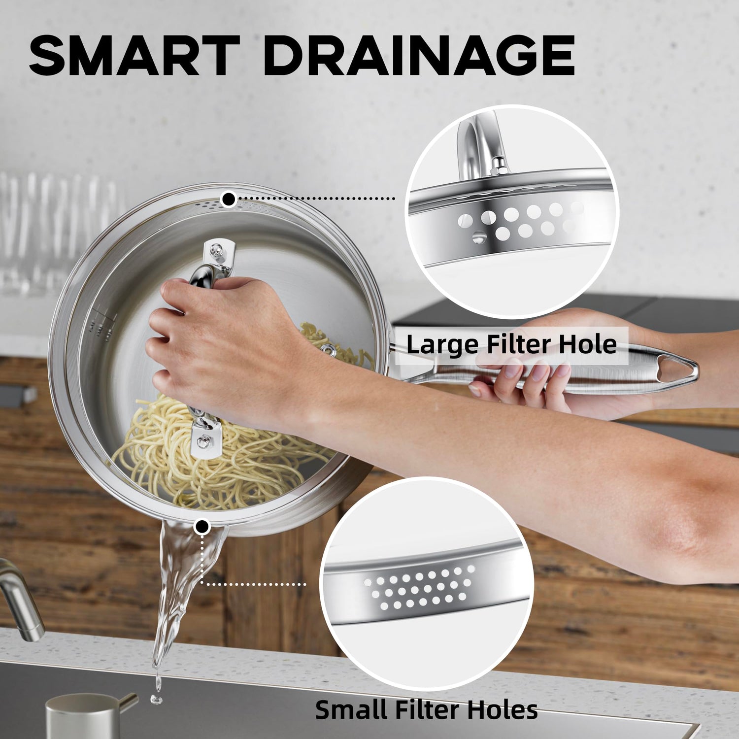 • Efficient Drainage System: Equipped with a large drainage hole on one side and a small drainage hole on the lid, our saucepan allows for easy and precise pouring, giving you control over the amount of liquid you want to drain