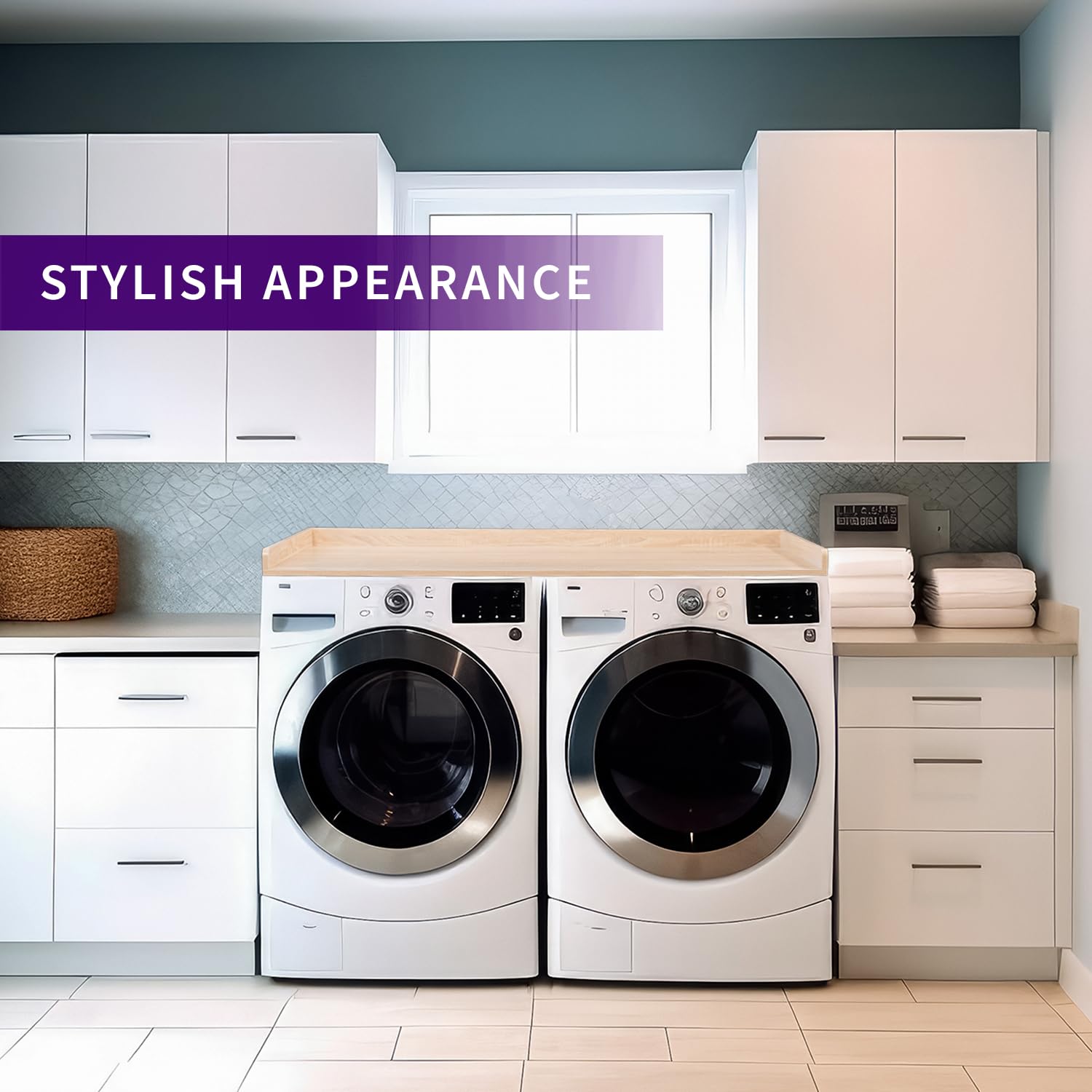 - Washer Dryer Countertop - Place this stylish countertop on top of your front-loaded washer and dryer set for space-efficient, functional storage.