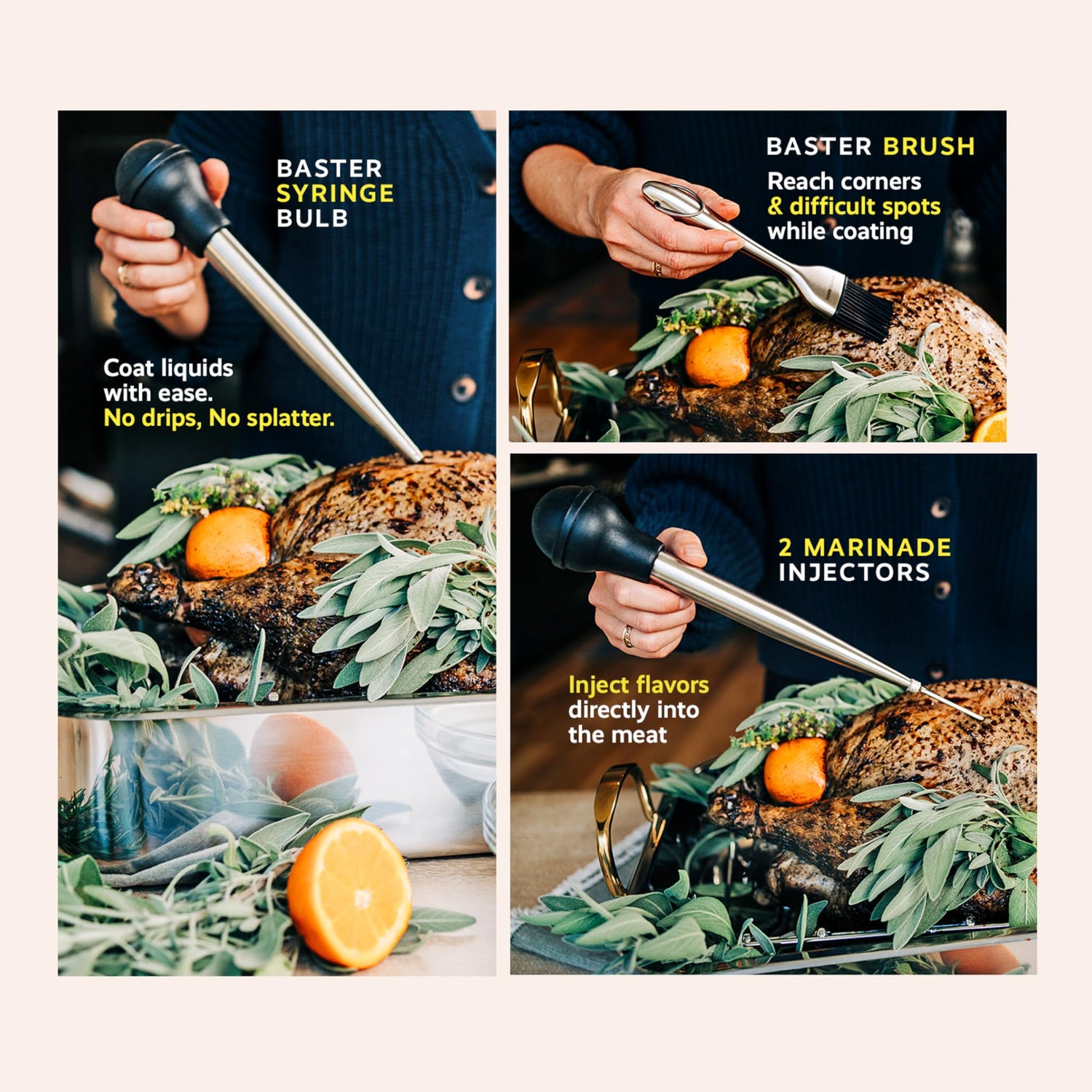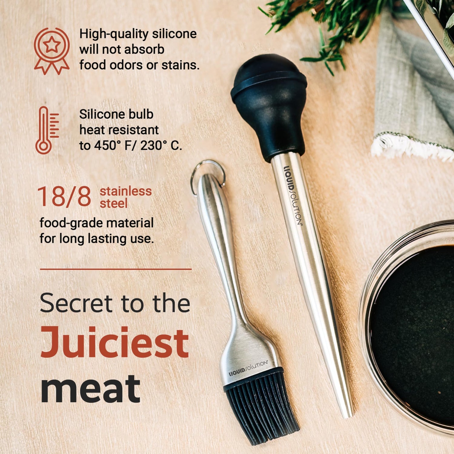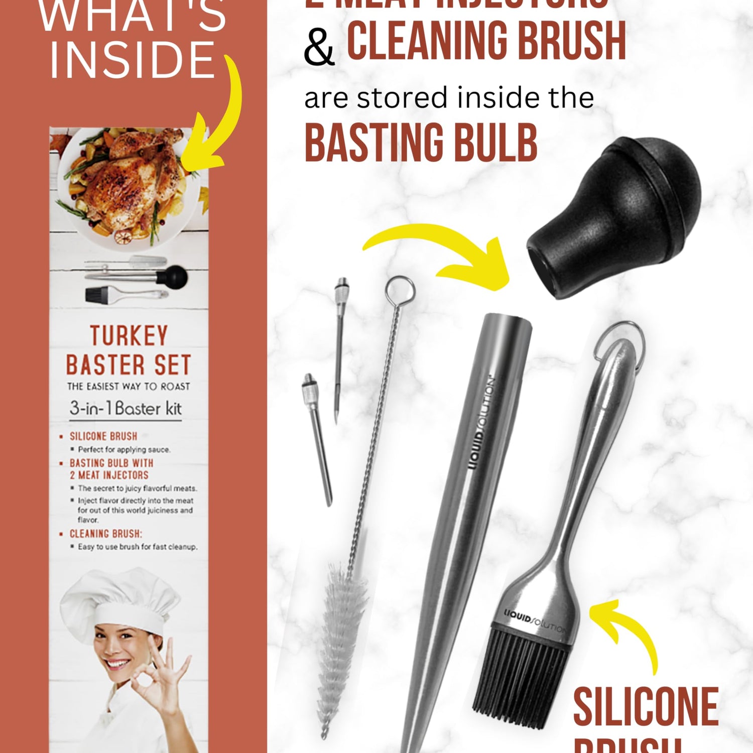 • Complete Set: The Liquid Solution turkey baster set includes a baster for adding moisture and flavor, two stainless steel injectors for deep flavor infusion, a basting brush for precise application, and a cleaning brush for easy maintenance.