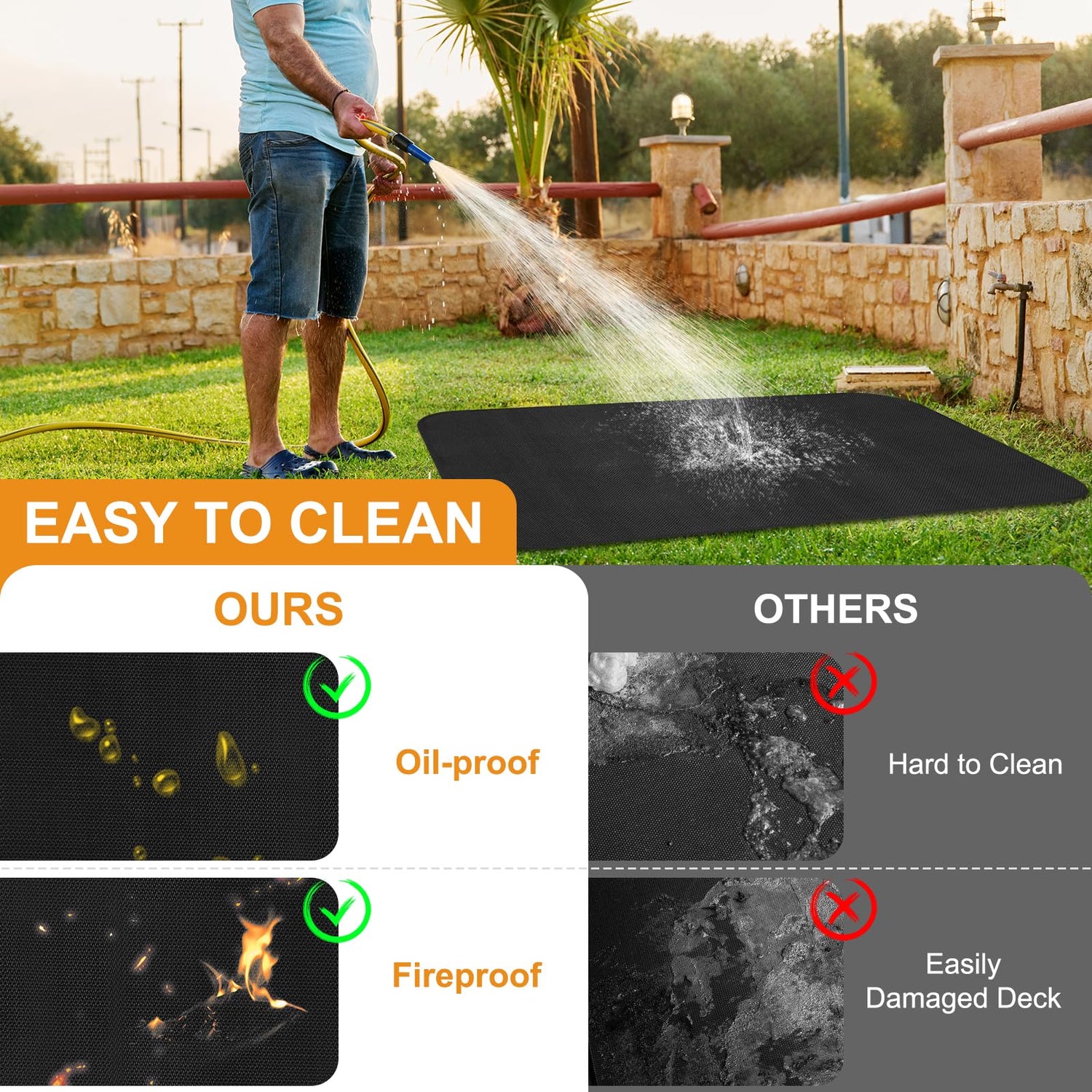 - Easy to Clean:The black barbecue mat is waterproof and oil-proof fireproof design, reusable, partial cleaning just need to wipe with a wet towel, when cleaning the whole fireproof mat, just rinse with soapy water or garden hose, it can be folded up, easy to carry and store, perfect for outdoor camping barbecue