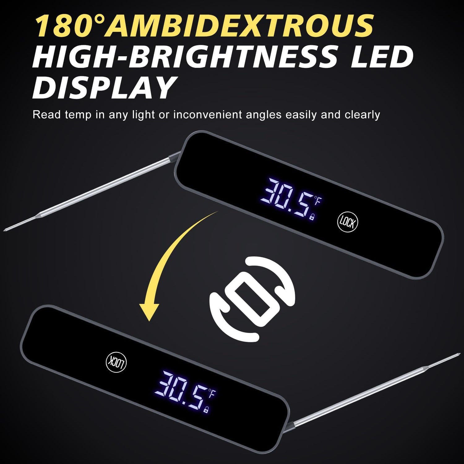 - 【180° Rotating Clear LCD Display】The BBQ thermometer with backlight LCD display and 180° auto-rotation gives you a clear view of the temperature, whether it's in a poorly light kitchen or outside in too much light. The ergonomic handle is comfortable to hold, even for gloved-wearers, awkward angles or left-handed chef can be easier to use it