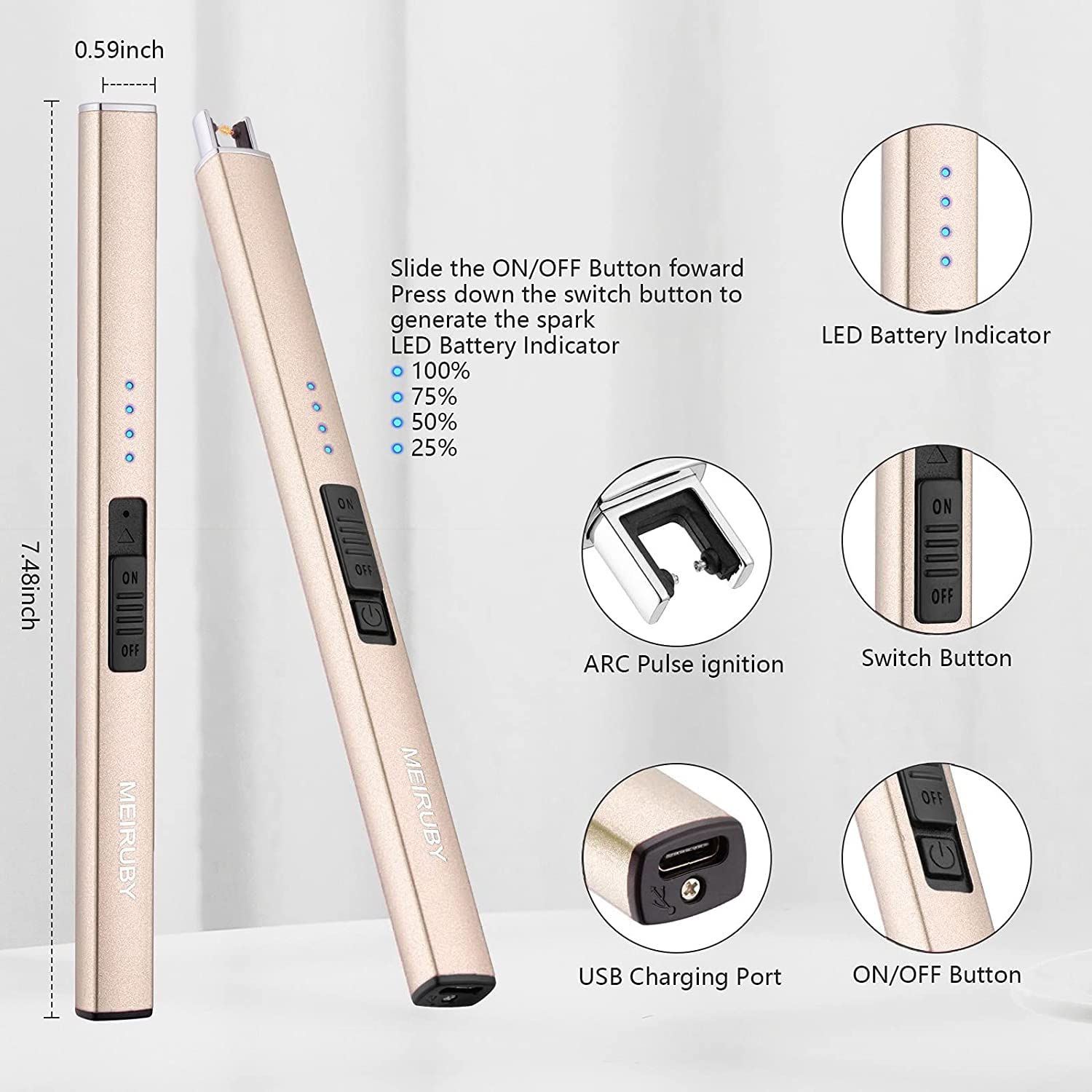 MEIRUBY Lighter Electric Candle Lighter Long Electronic Rechargeable USB Lighter Arc Windproof Flameless Lighters for Candle Camping BBQ Birthday Women's Day Gifts for Women Mom Wife Men, Gold