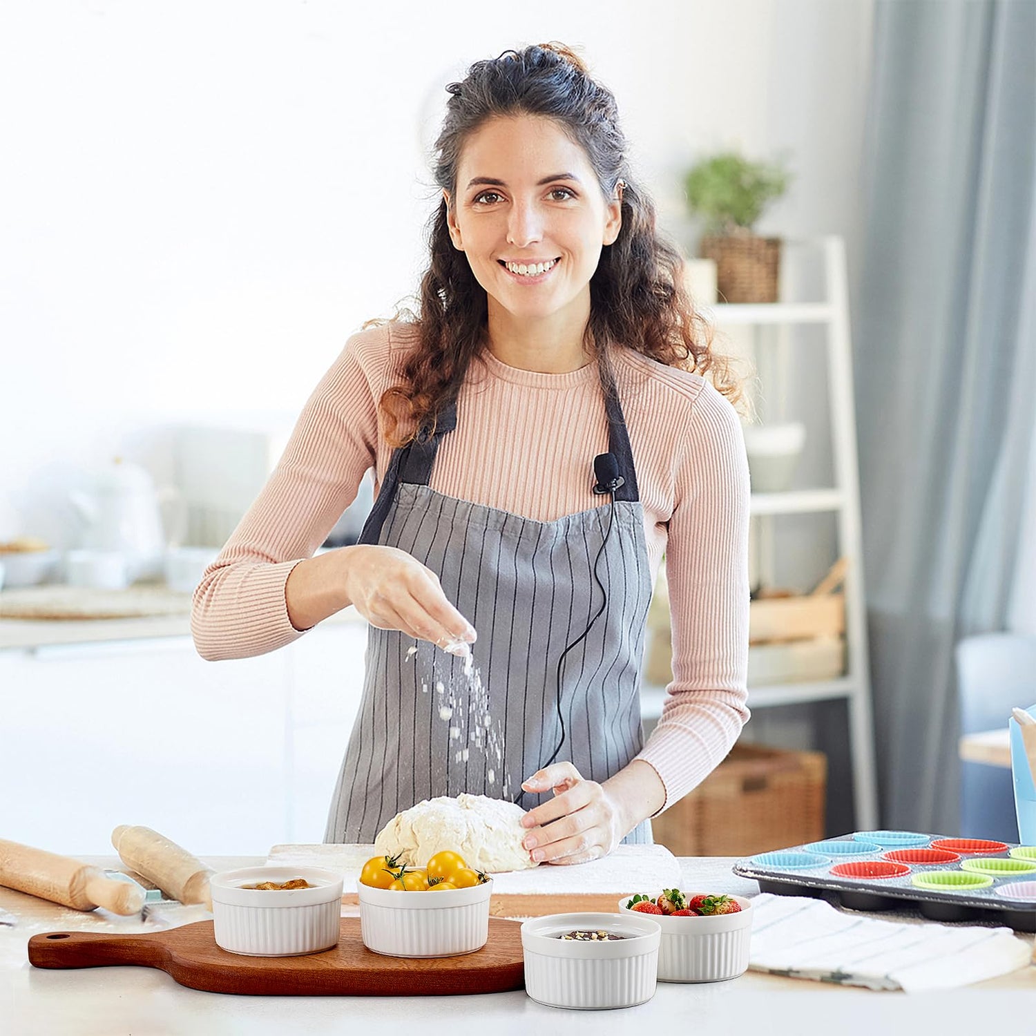 • 【MULTIPLE USES】: These 8 ounce ramekins are ideal for baking and serving a variety of dishes, like souffle, creme brulee, lava cakes, dipping sauces, french onion soup, olives, quiche, and ice cream, and even as a stand-in for a mini prep bowl or a salt cellar. The round shape and proper thickness ensure the baking effect.