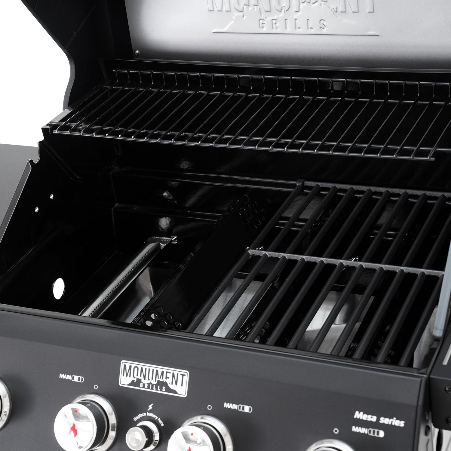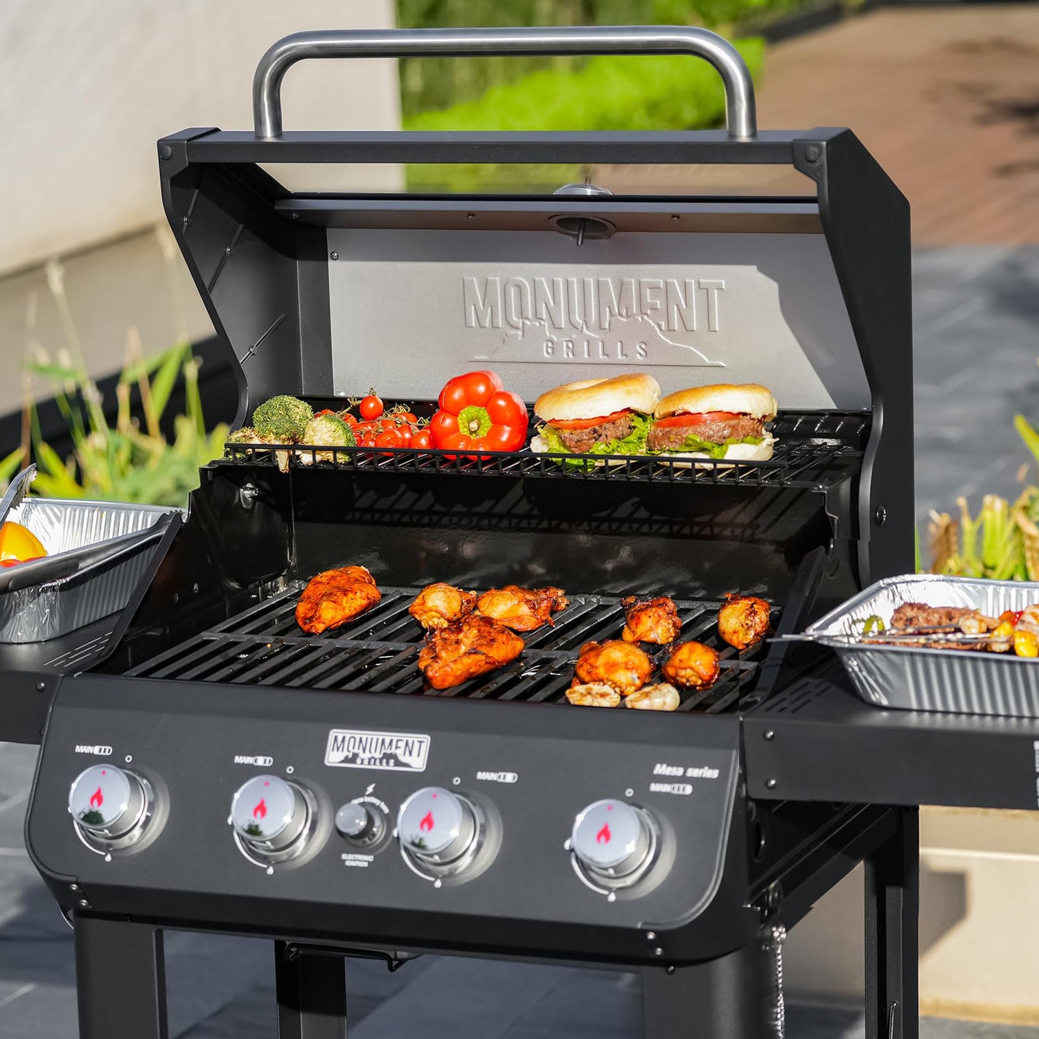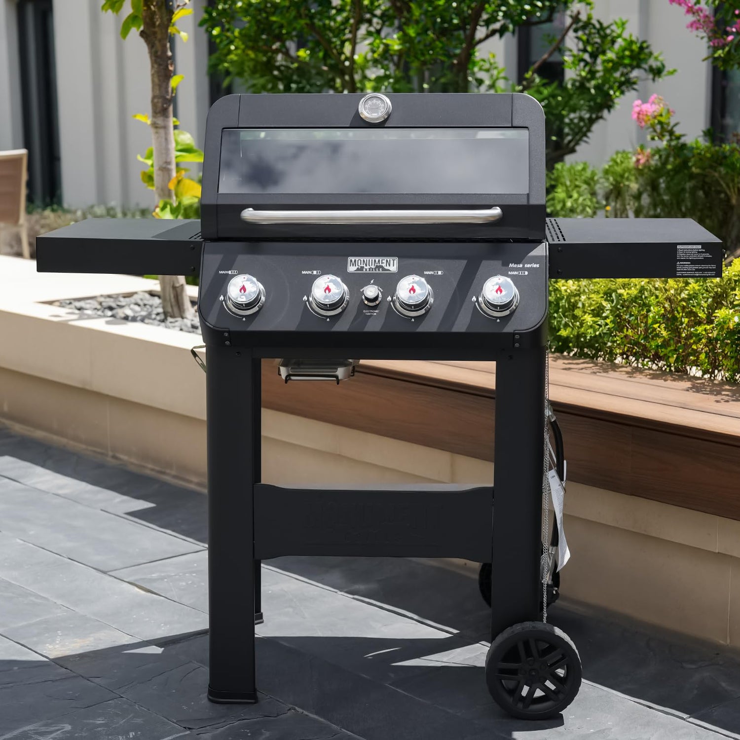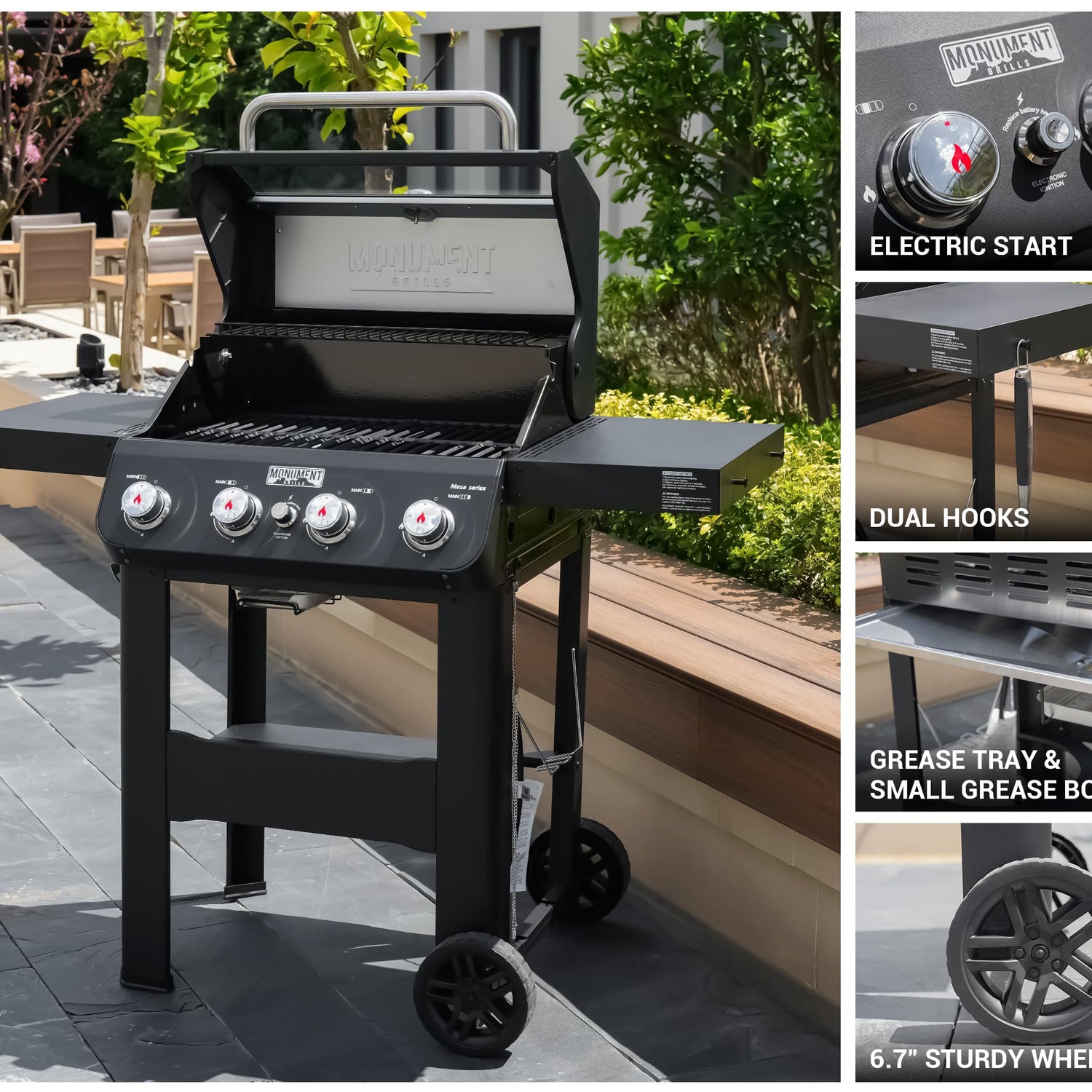 Monument Grills 4-Burner Liquid Propane Gas Grill, Black Stainless Steel Grill with Clearview® Lid and One Foldable Shelve for Outdoor Cooking Kitchen and Patio Backyard, Mesa420MF with BBQ Cover