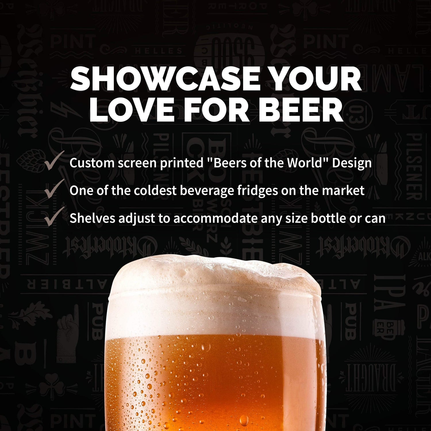 Details: Show off your home bar or man cave with the custom designed "Beers of the World" 126-Can Beverage Fridge. The exterior is screen printed in durable graphic lettering to proudly show off your favorite beer varieties from all over the world. Inside, you get the same icy chill and organizational features that you've come to expect from Newair products.