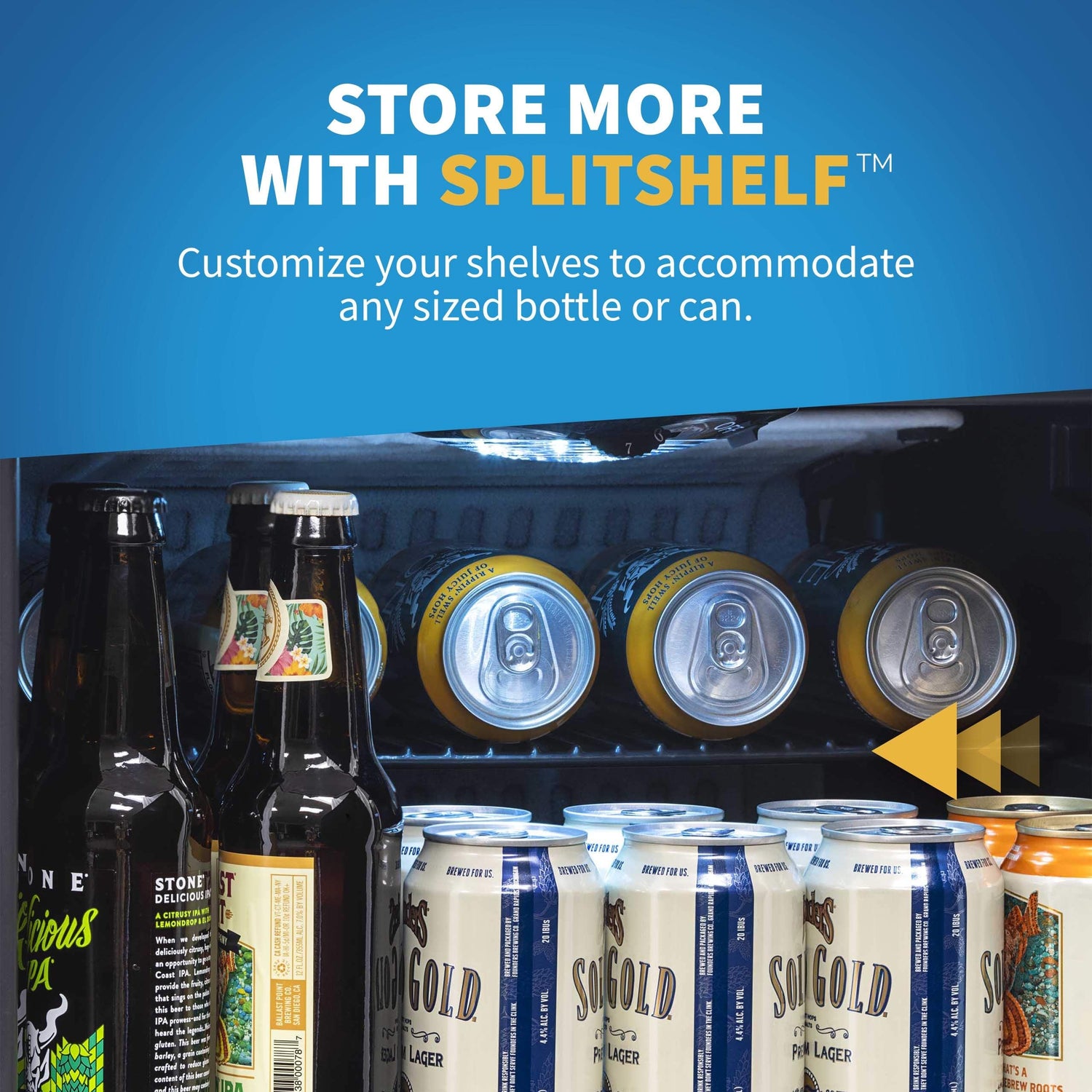 The "Beers of the World" fridge features sleek, black SplitShelf design that lets you double the number of cans you store. The half-depth shelves allow you to stack cans with different footprints on top of each other. If you prefer bottles, place them in front of a half shelf so they can stand upright. With SplitShelf, you've got options.