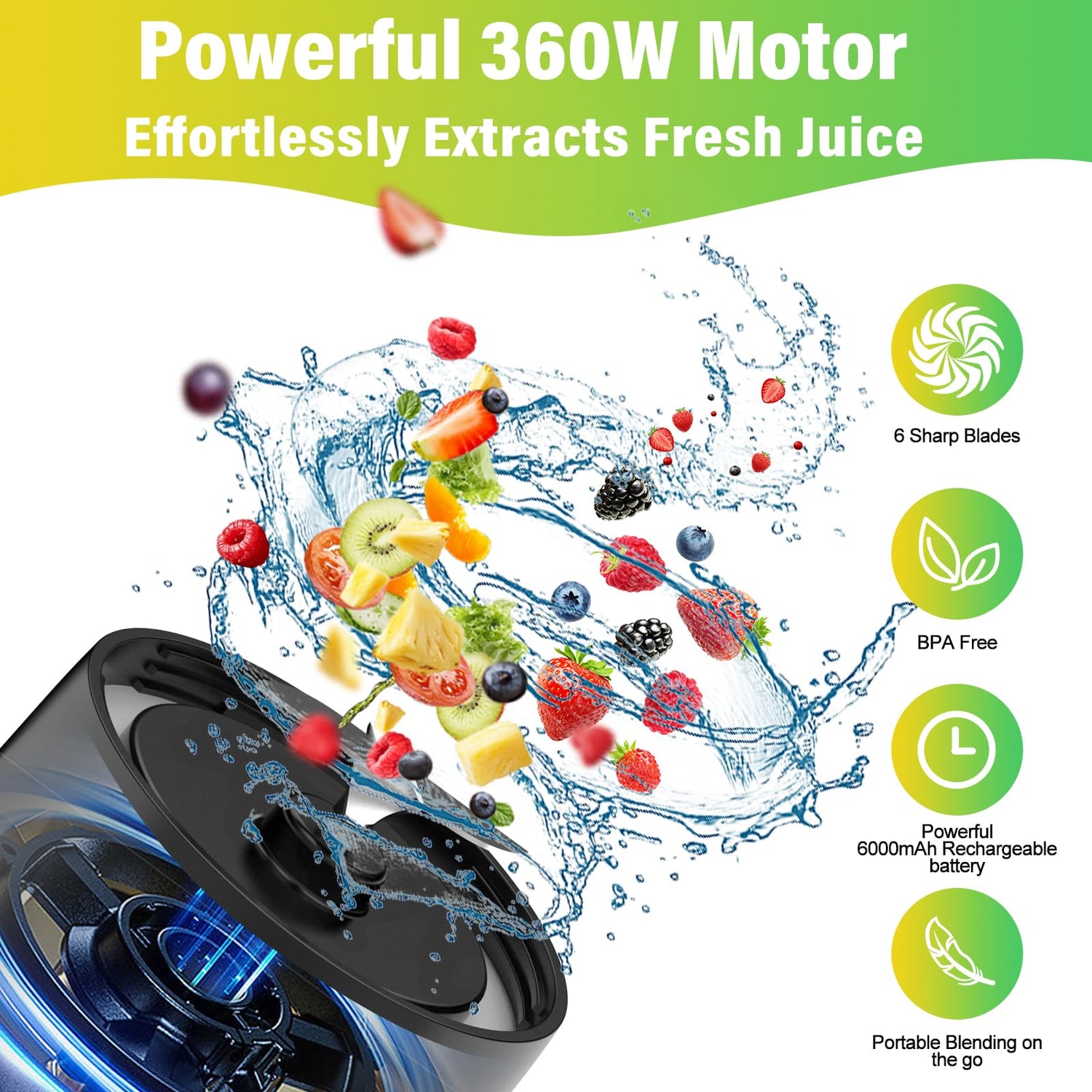 - Powerful Battery and USB Rechargeable: The rechargeable blender is equipped with a built-in 6000mAh battery and Equipped with a 360W powerful motor providing up to 40 cups of fresh juice on a single charge. The personal smoothie blender features a USB-C charging port, allowing you to charge it using a power bank, laptop, car charger, or USB charger. You can use the portable juicer to make any flavor you want, anytime and anywhere, without worrying about running out of power.