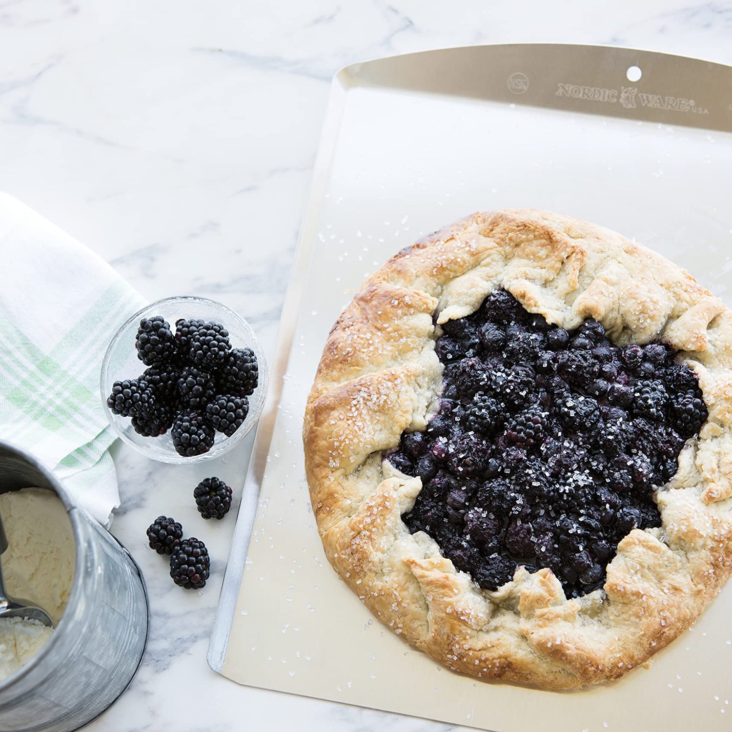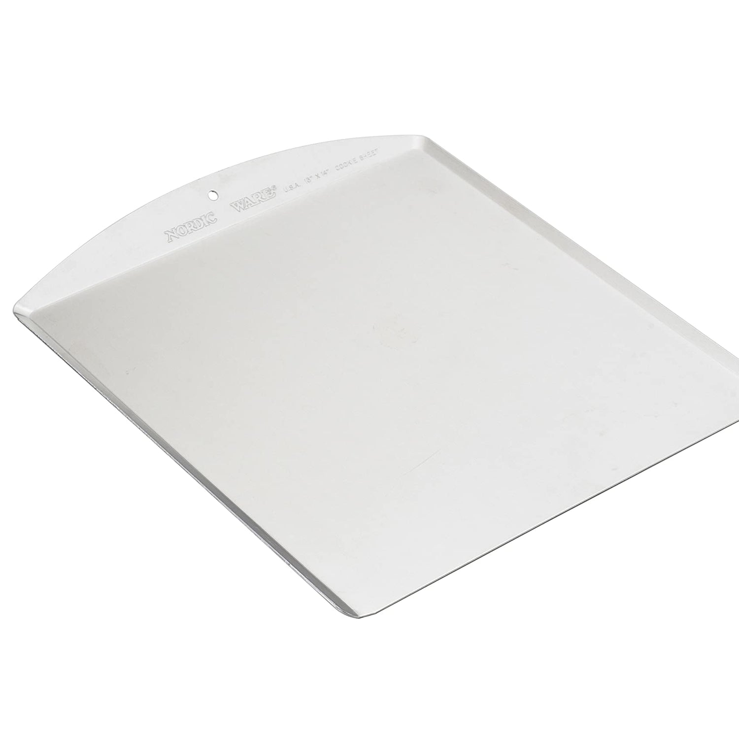 A staple item in any kitchen, the cookie sheet has the built-in promise of many tasty pleasures to come. NordicWare's traditional version is constructed of uncoated, commercial-grade aluminum in a roomy 13-by-14-inch size to evenly circulate heat over large batches of the day's chosen treat. The light silver finish discourages overheating so insides have time to cook thoroughly while outsides gain a light-brown crunchiness. Finished with a nonstick coating, freshly baked goods slide off the sheet with ease, while the slanted end handle helps the cook maintain a firm, secure grip. The baking tool is rust- and corrosion-proof. Part of NordicWare's Natural series, it is made in the USA. --Kara Karll