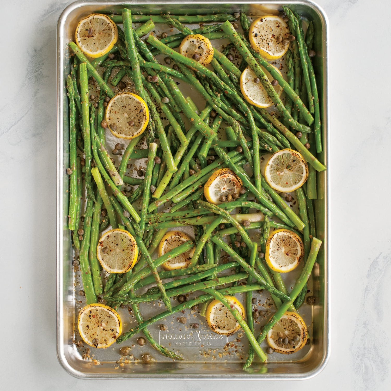 Details: Professional pastry chefs and bakeries bake on aluminum sheets for perfect results. You can too, with our commercial quality Naturals® Bakeware collection. Made of pure aluminum, these premium pans produce evenly browned baked goods every time. Rims are reinforced with galvanized steel to prevent warping and aluminum will never rust. This standard jelly roll pan is slightly smaller than our half sheet. Fits European sized ovens. For baked veggies, French fries, muffins, cookies, cakes and more. Use & Care: 1. Before initial use and after subsequent uses, hand wash with warm, soapy water. 2. Dishwasher use is not advised, as discoloration will occur due to the cleaning agents used in automatic dishwasher detergent. This discoloration is merely cosmetic and will not affect baking properties or safety of the pan. 3. Natural aluminum pans work well with parchment paper, silicone baking mats, and also traditional butter or shortening and flour methods. When roasting savory foods such as vegetables, butter or cooking oil work well. 4. Nylon, wood, or silicone utensils are recommended. Metal utensils and scouring pads may scratch natural aluminum pans, but will not affect baking performance.