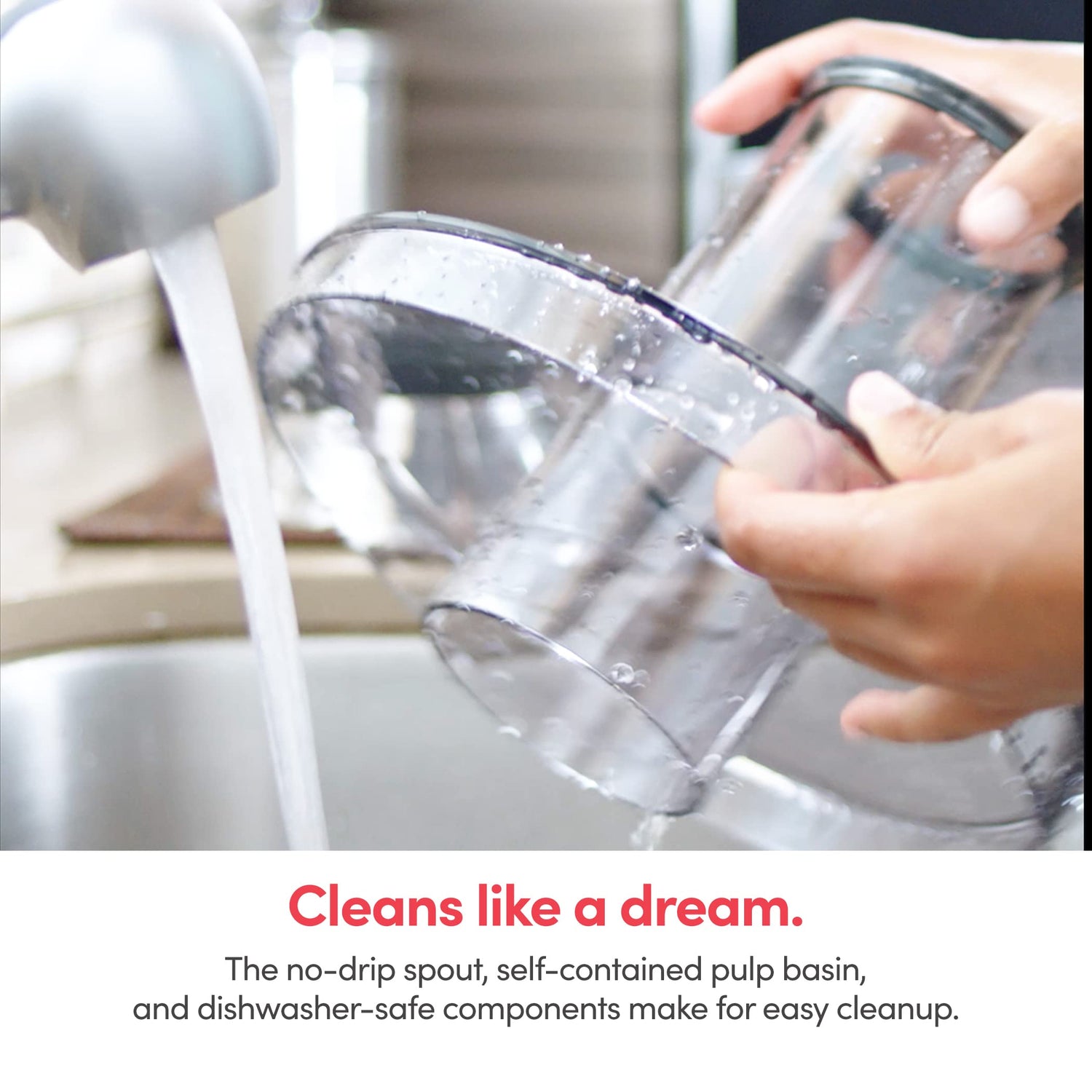 - Lift off our self-contained pulp basin and bring it right to your sink. The sieve, pulp basin and juice pitcher are all dishwasher-safe.