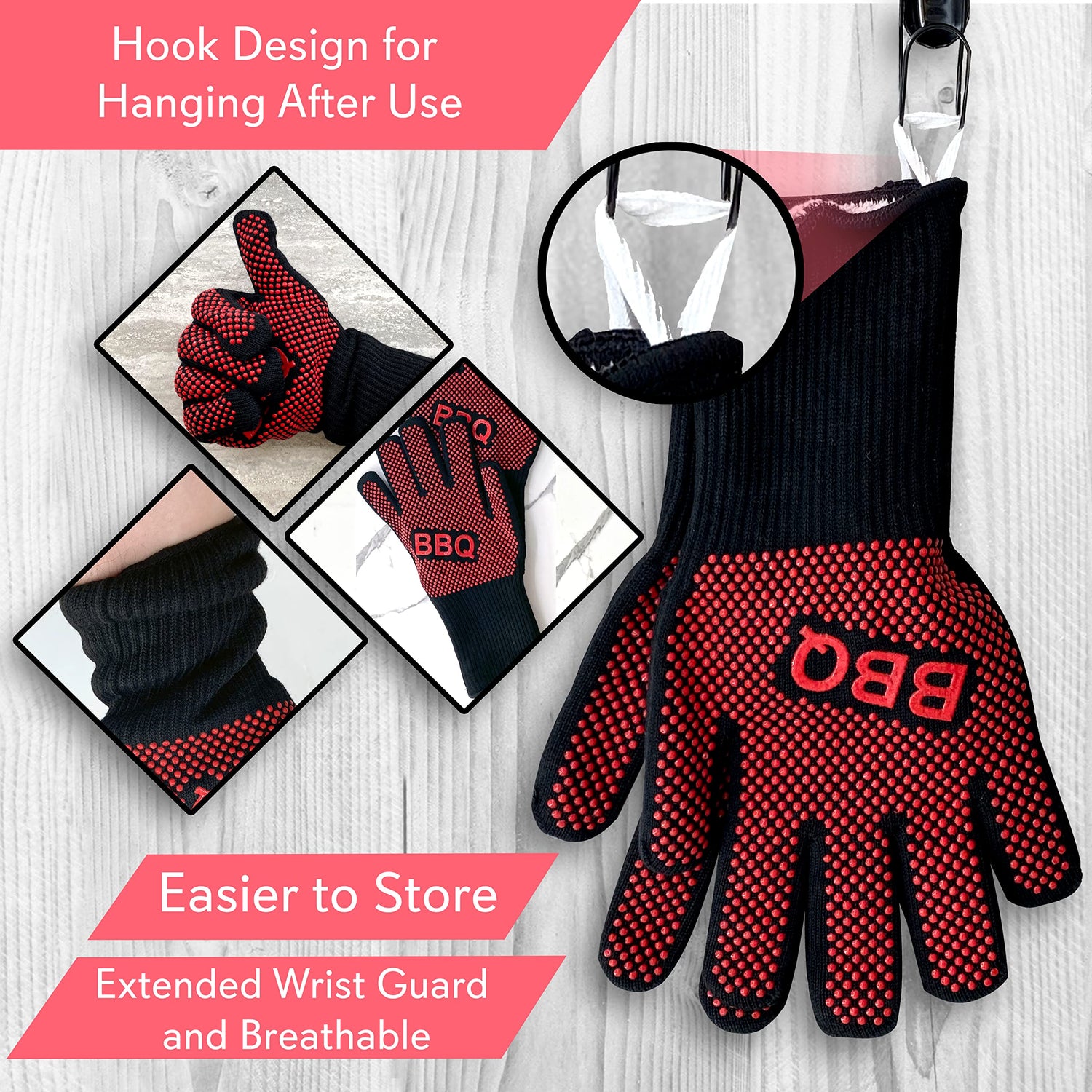 Details: Features: - Extreme Heat Resistant Up to 1472? (800 Degree Celcius) - Greatest Protection When Grilling or in the Kitchen - Easily Handle the Food Out of the Pot or on the Grill - Universal Size & Flexible and Washable - Non-slip Silicone Material for a Great Grip - Heat-Resistant Fiber - Soft Inner Cotton for Double Protection & Comfortable - 5 inches Long Sleeve Design - Hook Design for Hanging After Use - Easier to Store - Extended Wrist Guard and Breathable What's in the Box: - (2) BBQ Grill Gloves Technical Specs: - Maximum Temperature: Up to 1472? or 800°C - Construction Materials: Oxidized Fiber, Silicone and Polyester Cotton - Thickness: 4.5mm - Product Dimensions (L x W x H): 12 7/8'' x 7 1/4'' x 0.5'' -inches