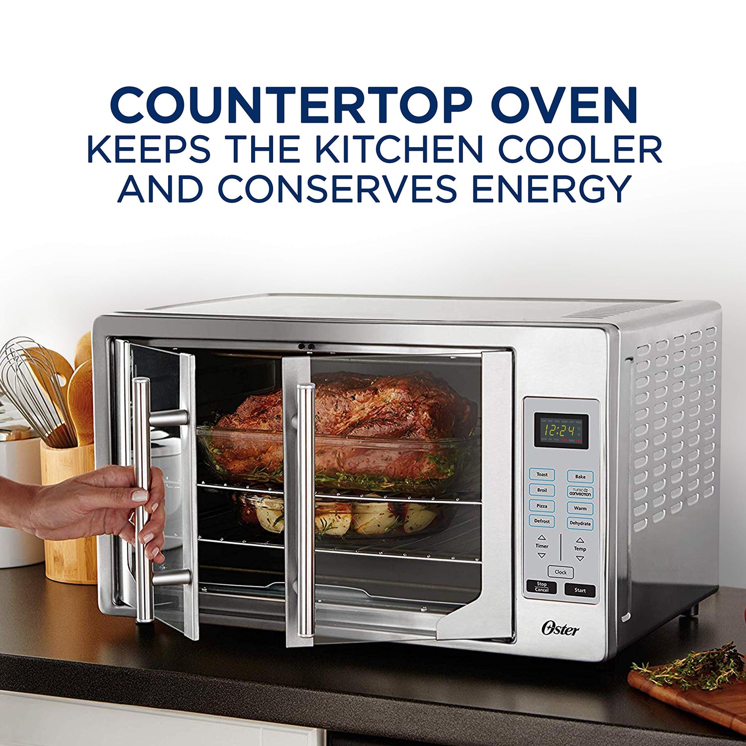 Details: Voila, dinner’s done; The Oster Digital French Door Oven looks elegant, cooks with convection and makes meal prep easier. Unique design opens both doors with a single pull so you can place dishes in the oven without hassle. Digital controls provide added convenience to bake, toast, broil, warm and convection cook in just one touch. Control panel also includes touch commands for pizza, dehydrate and defrost, as well as adjustable time and temperature settings. There’s no reason to turn up the heat with your conventional oven, as the Oster Digital French Door Oven cooks more efficiently, using up to 50 percent less energy. With 90 minute timer, your foods cook as long as you need, then the oven shuts off automatically. With a countertop oven this attractive, this efficient and this easy to use, you’ll enjoying using it for every meal you prepare.