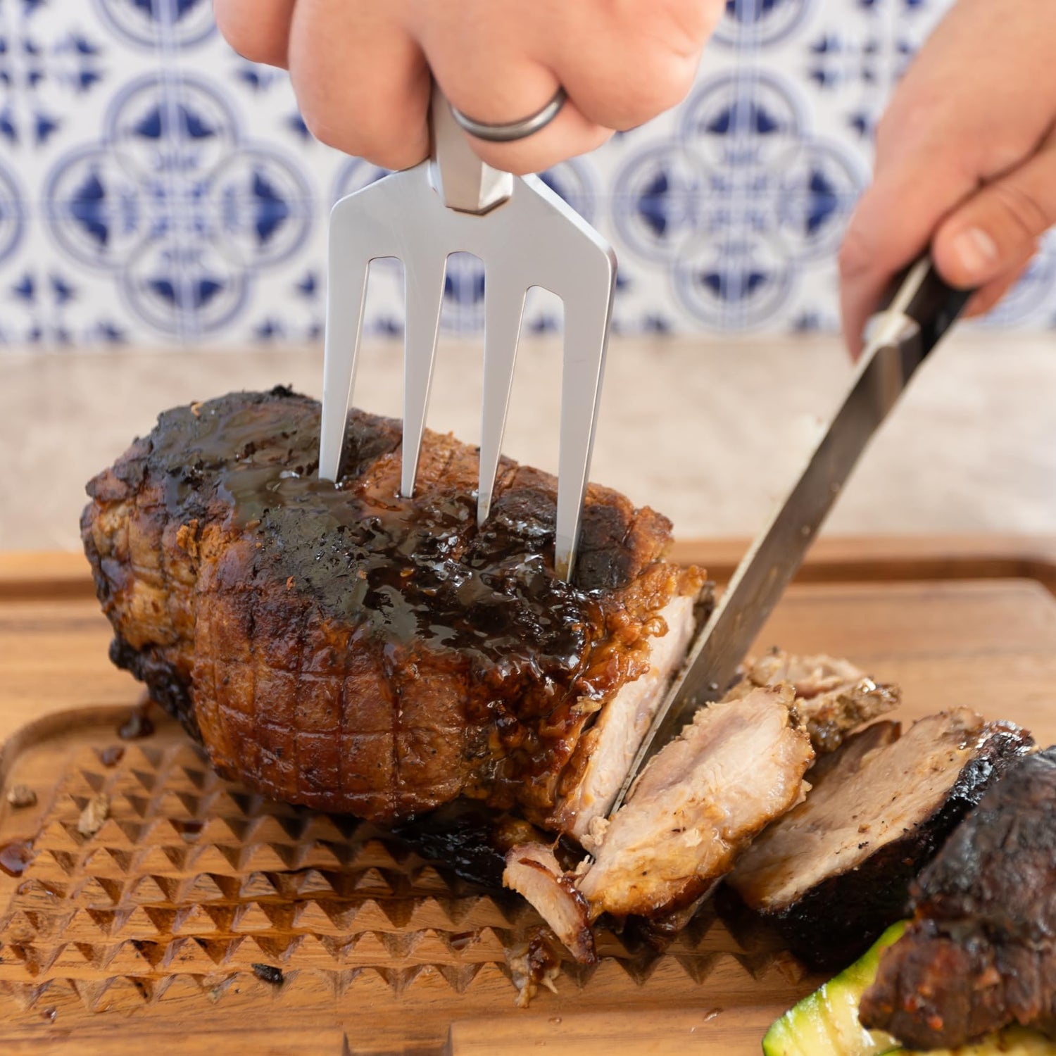 - CARVE: Whether it is brisket, roasts, tenderloin, chicken, turkey, or pork this metal meat fork is the perfect tool for expertly carving a large piece of meat. The four prongs of the fork keep the meat stable and in place while you carve. The bull handle fits comfortably in your hand to help avoid cramping and slipping.