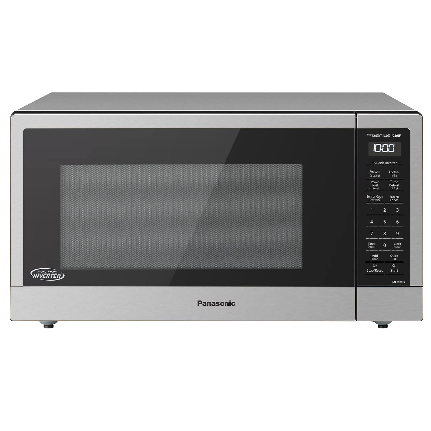 Details: The Panasonic NN-SN76LS Cyclonic Wave Microwave Oven with Inverter Technology has 1250-watts of cooking power and makes cooking, defrosting and reheating quick and simple. At every temperature level, Cyclonic Wave circulates heat in ultra-efficient 3D waves for easier food preparation, even with denser, more complex food textures. Inverter Technology delivers a constant stream of cooking power at every temperature for more evenly cooked meals, edges to center. With the touch of the Genius Sensor button, this microwave takes the guesswork out of creating a great meal by automatically setting power levels and adjusting cooking or defrosting time. The sensor measures the amount of steam produced during cooking and calculates remaining cooking time at the appropriate power level. A selection of 14 auto cook options helps quickly prepare favorite foods, like pizza, popcorn, pasta, soup, oatmeal and other dishes. The Panasonic NN-SN76LS has a spacious 1.6 cu.ft. capacity, but takes up minimal counter space.