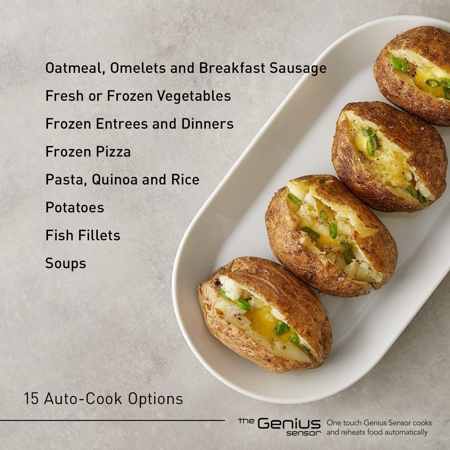 - Easier Microwaving with Genius Sensor and Auto Cook: 15 preset smart cooking options including fresh and frozen entrees and vegetables, oatmeal, soup, potatoes, pasta, pizza, rice and more