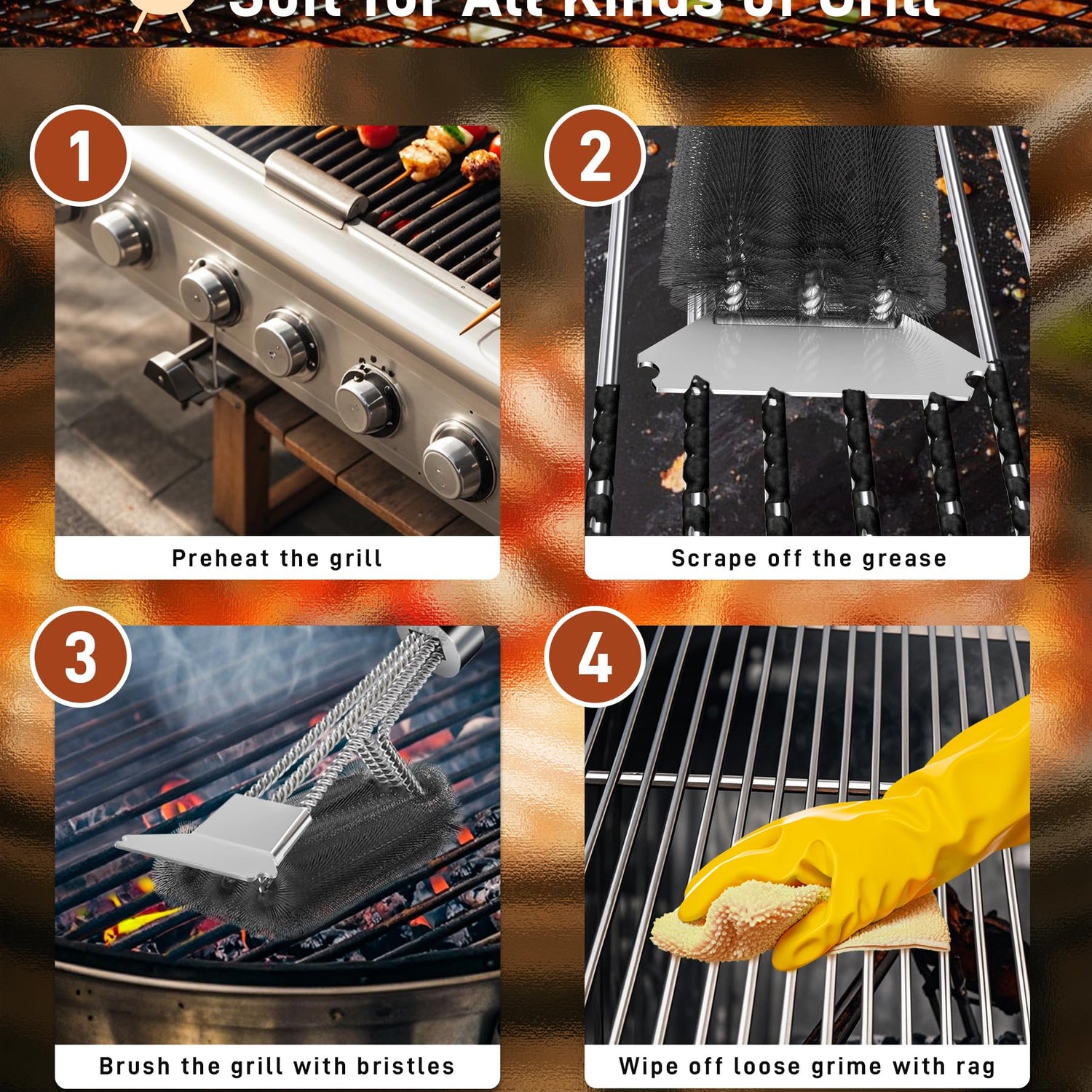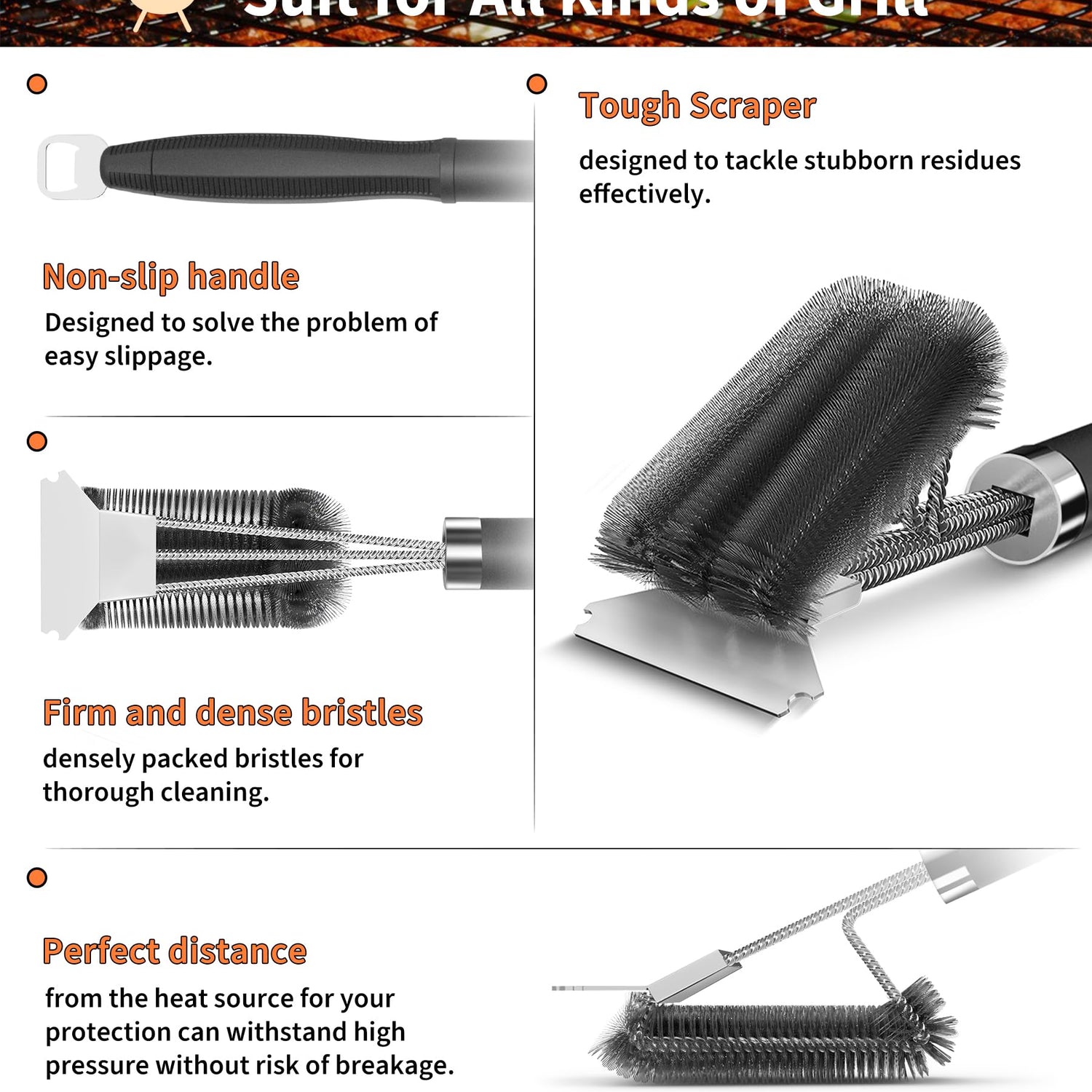 - Efficient Cleaning: The Pepeng Grill Brush is specially crafted, the moderately stiff brush can effectively remove stubborn residue and grease from your grill but without damaging the surface, making it look brand new after every use.