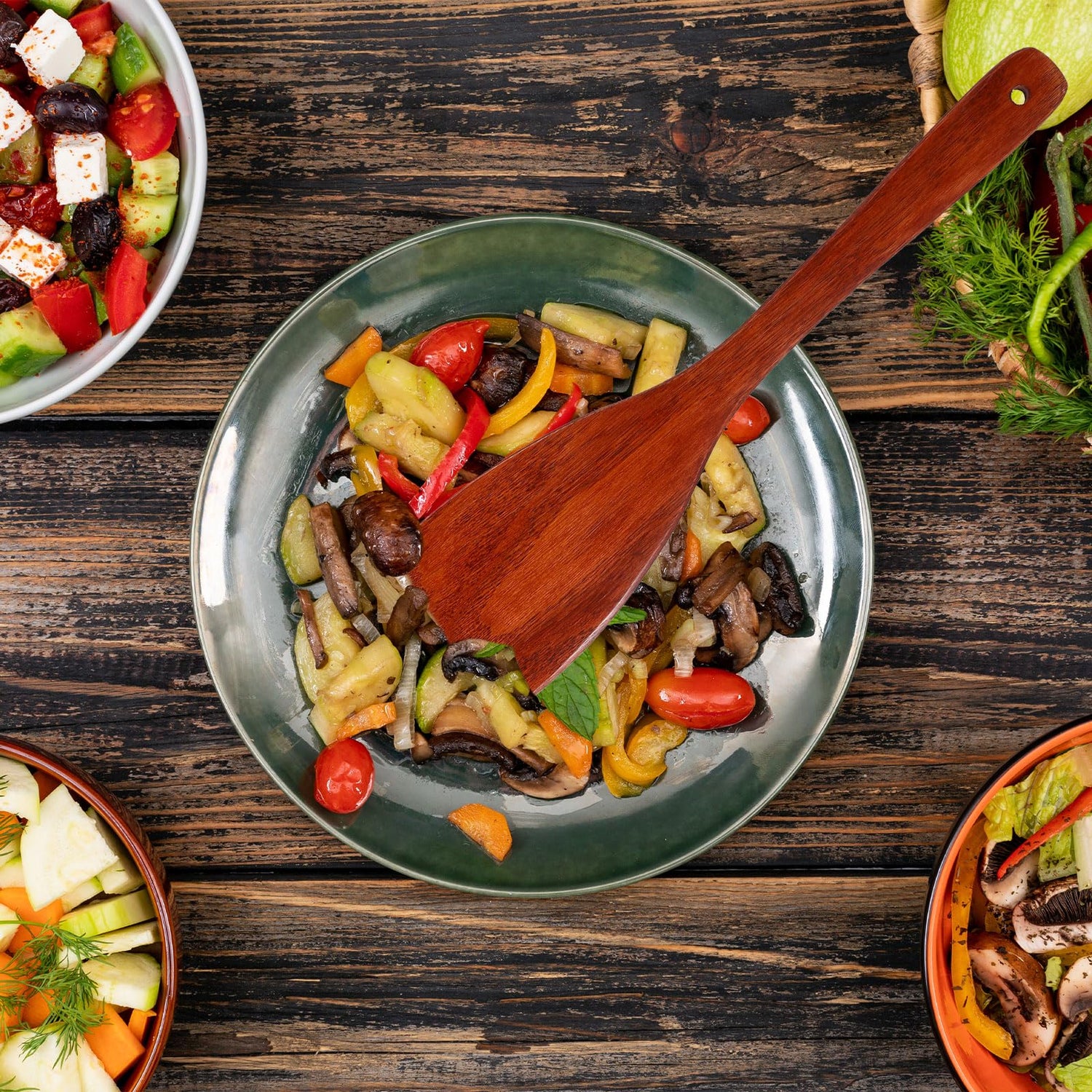 - Versatile: This wooden spatula for cooking is 13 inches in size, perfect for daily kitchen cooking; The wood spatula can be used to stir, mix, divide, flip and serve food; Each flat spatula is equipped with a hanging hole to save kitchen space