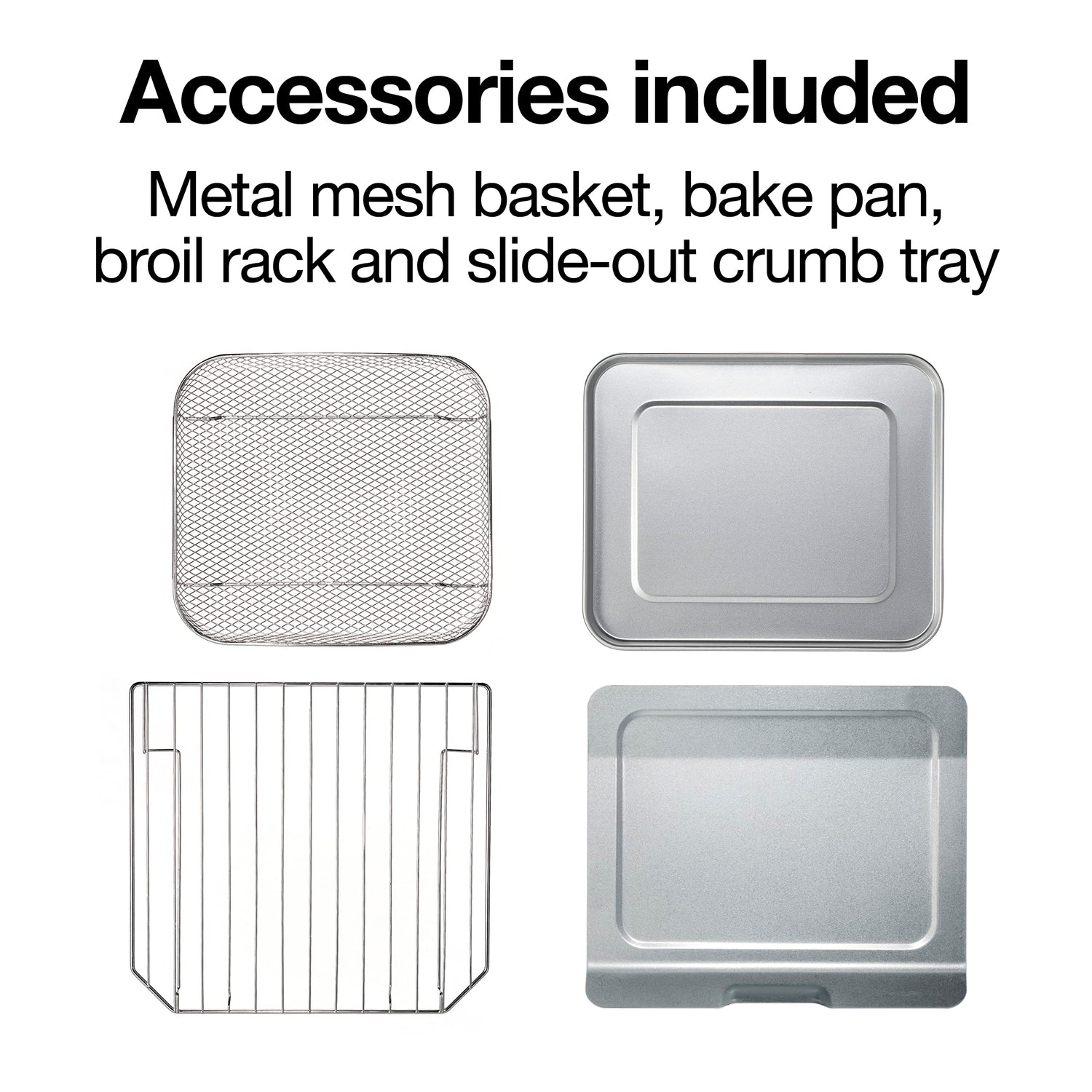 - INCLUDES MESH BASKET FOR AIR FRYING, BAKE PAN AND BROIL RACK: The air fryer oven comes with everything needed to air fry, bake, broil and toast, plus a slide-out crumb tray. Mesh basket fits on the upper oven rack with bake pan below to catch drippings.