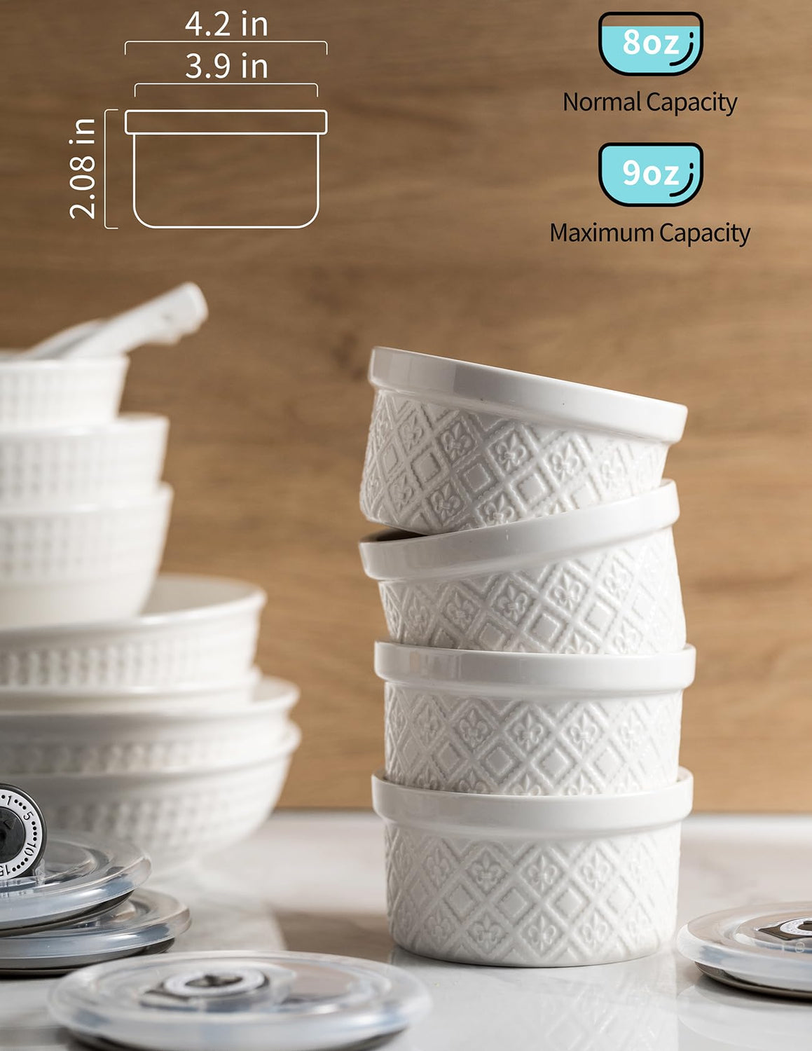 • Sizes for Varied Uses: Measuring 3.9 inches in diameter, 2.08 inches in height, and with a 9 oz capacity, these mini ramekins are the perfect fit for baking creme brulee, souffle, dipping sauces, puddings, ice cream, and custard