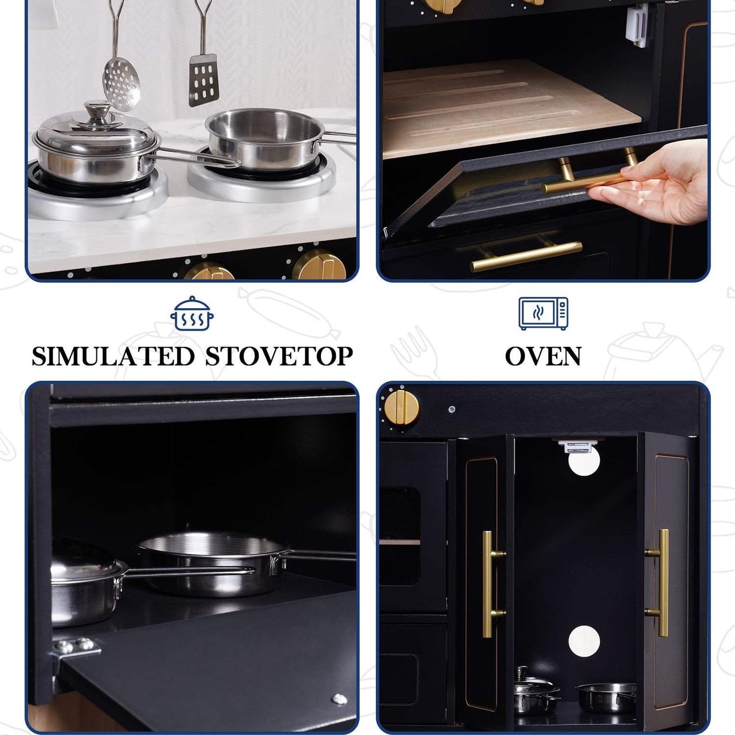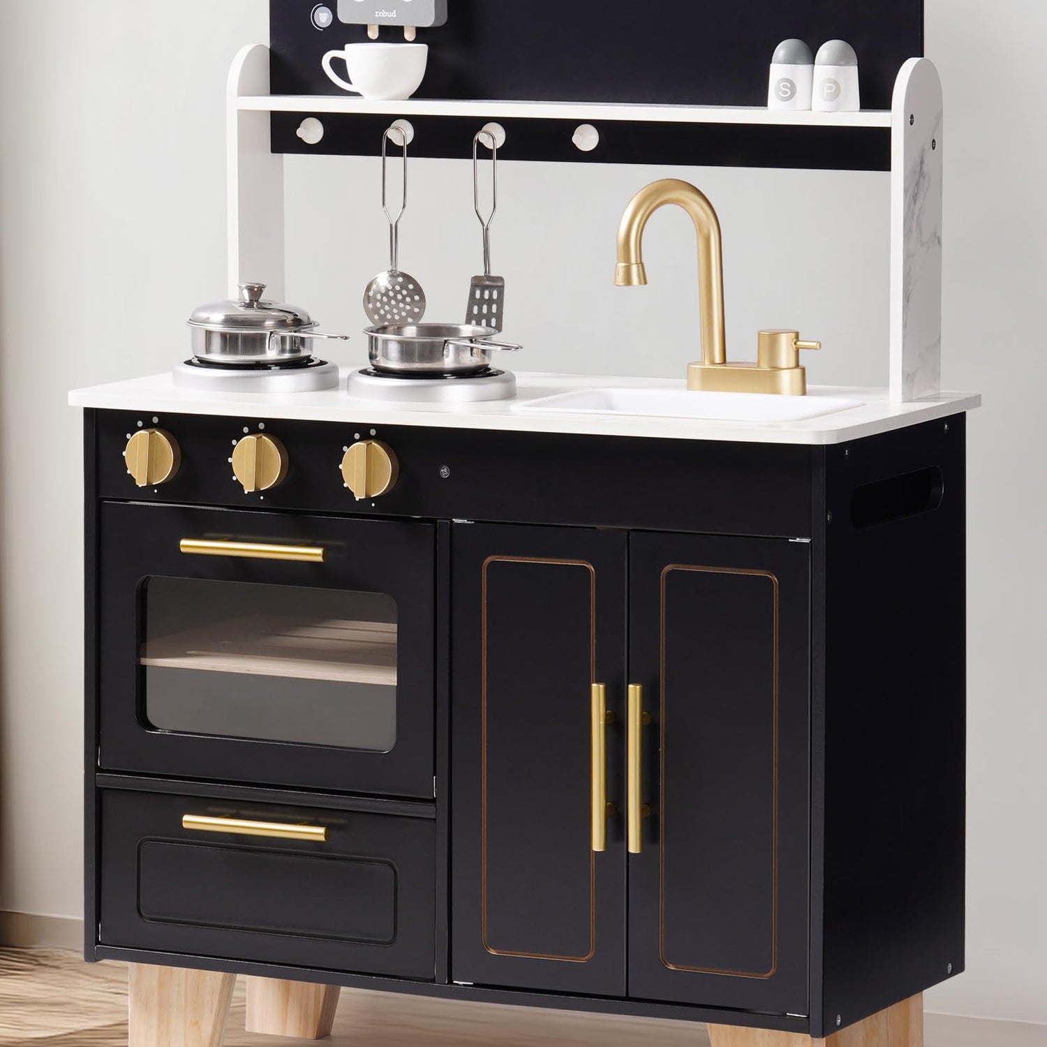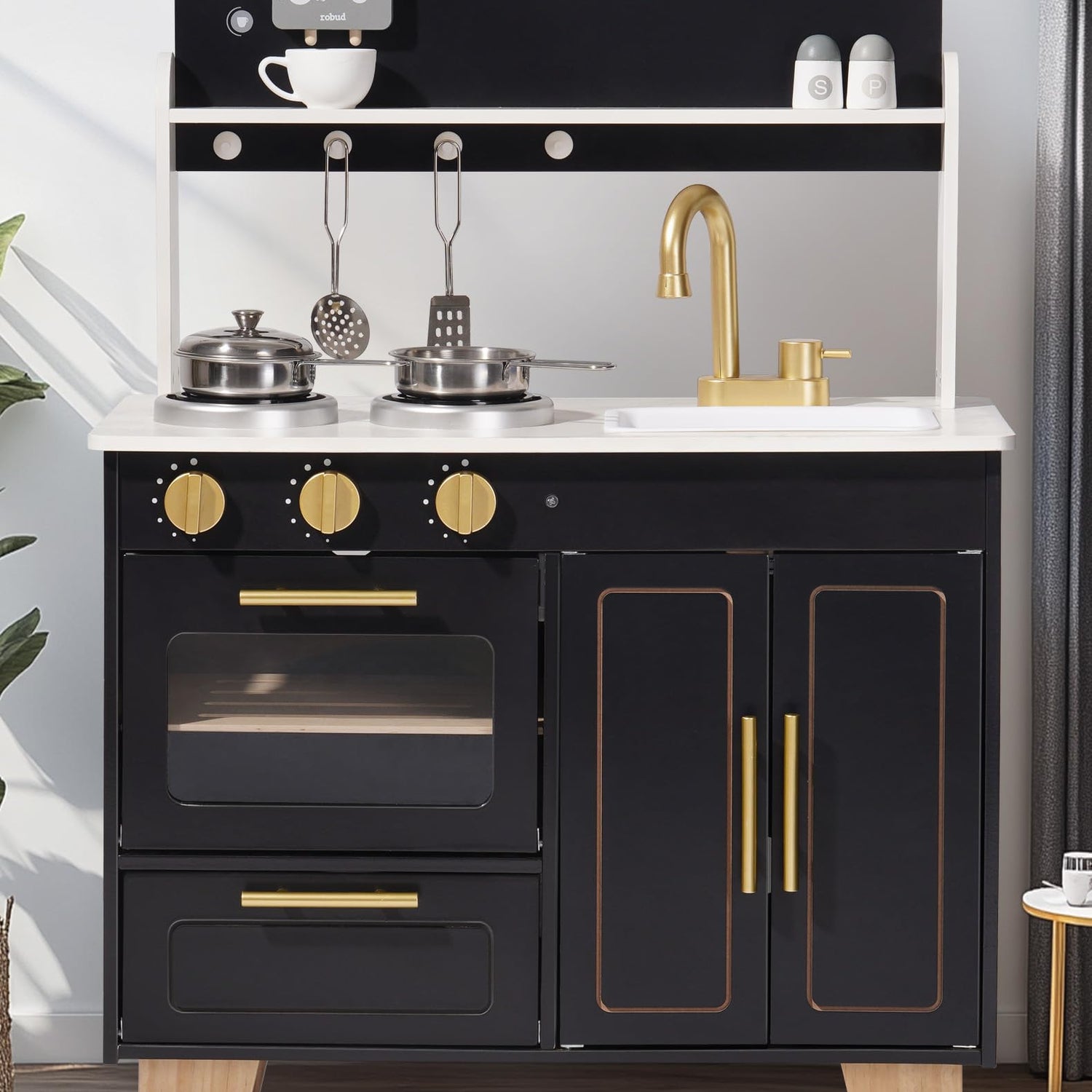 - 【Elegant Marble-Style Design】 This ROBUD play kitchen set features a sleek black and gold marble-style design, bringing a touch of elegance to your child's playtime. The set includes a realistic stove, oven, and sink, mimicking the look of a real kitchen.