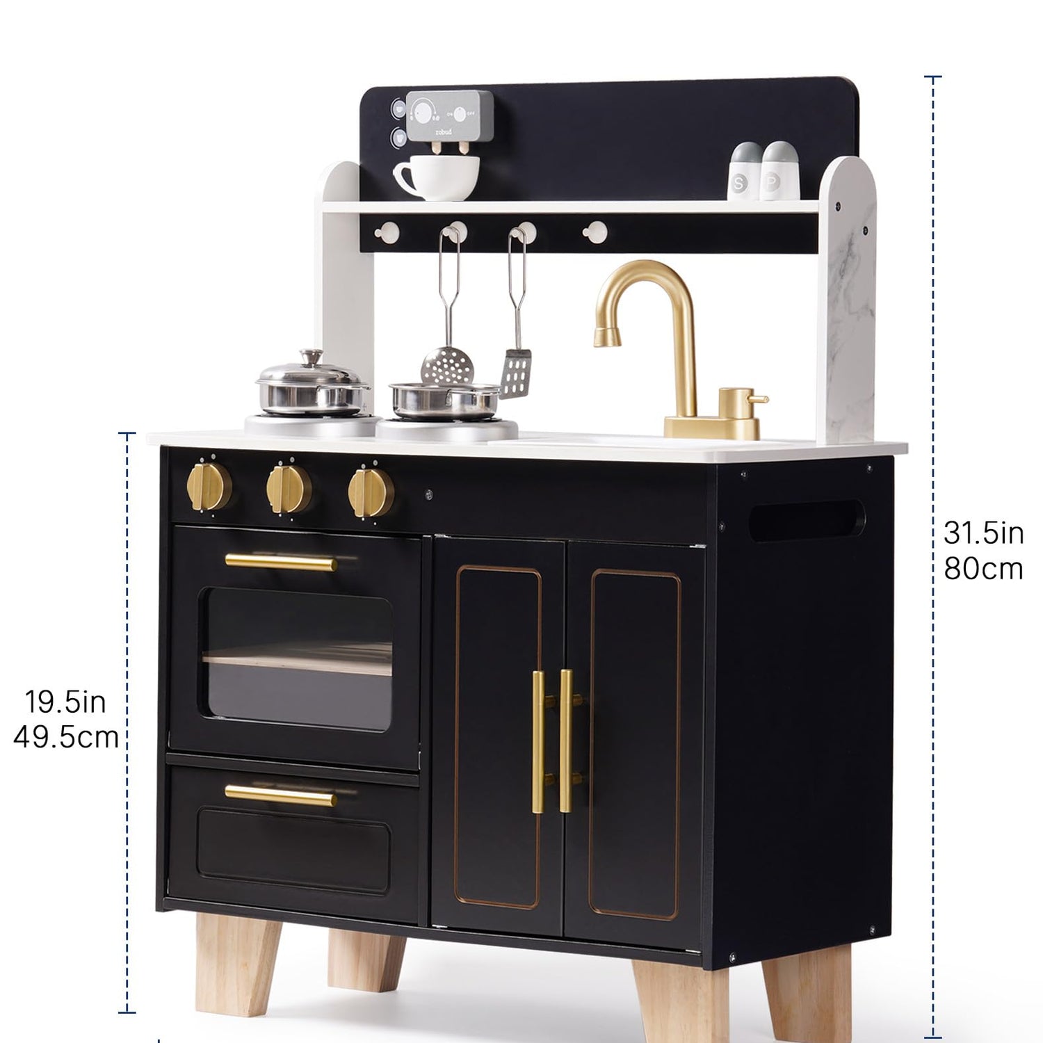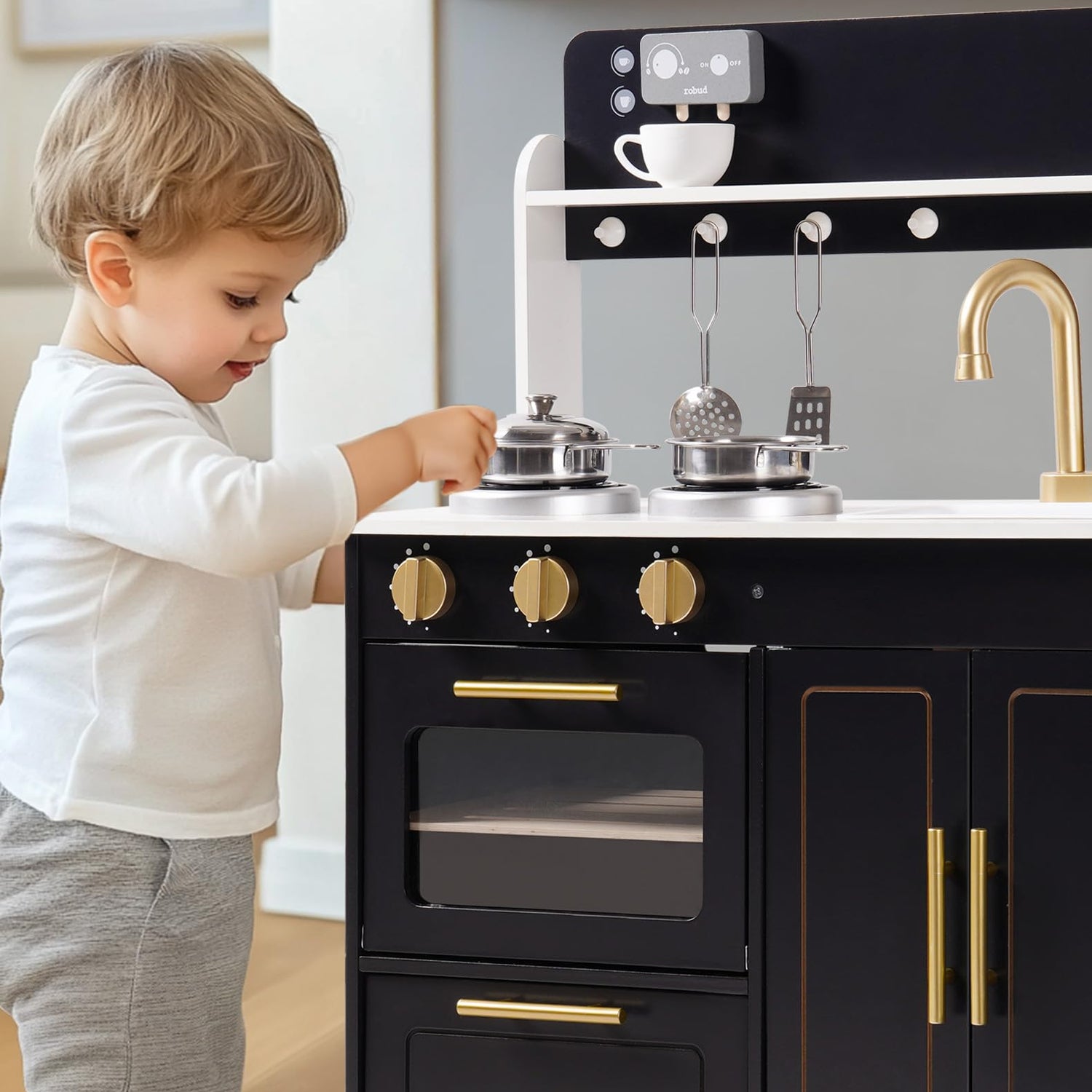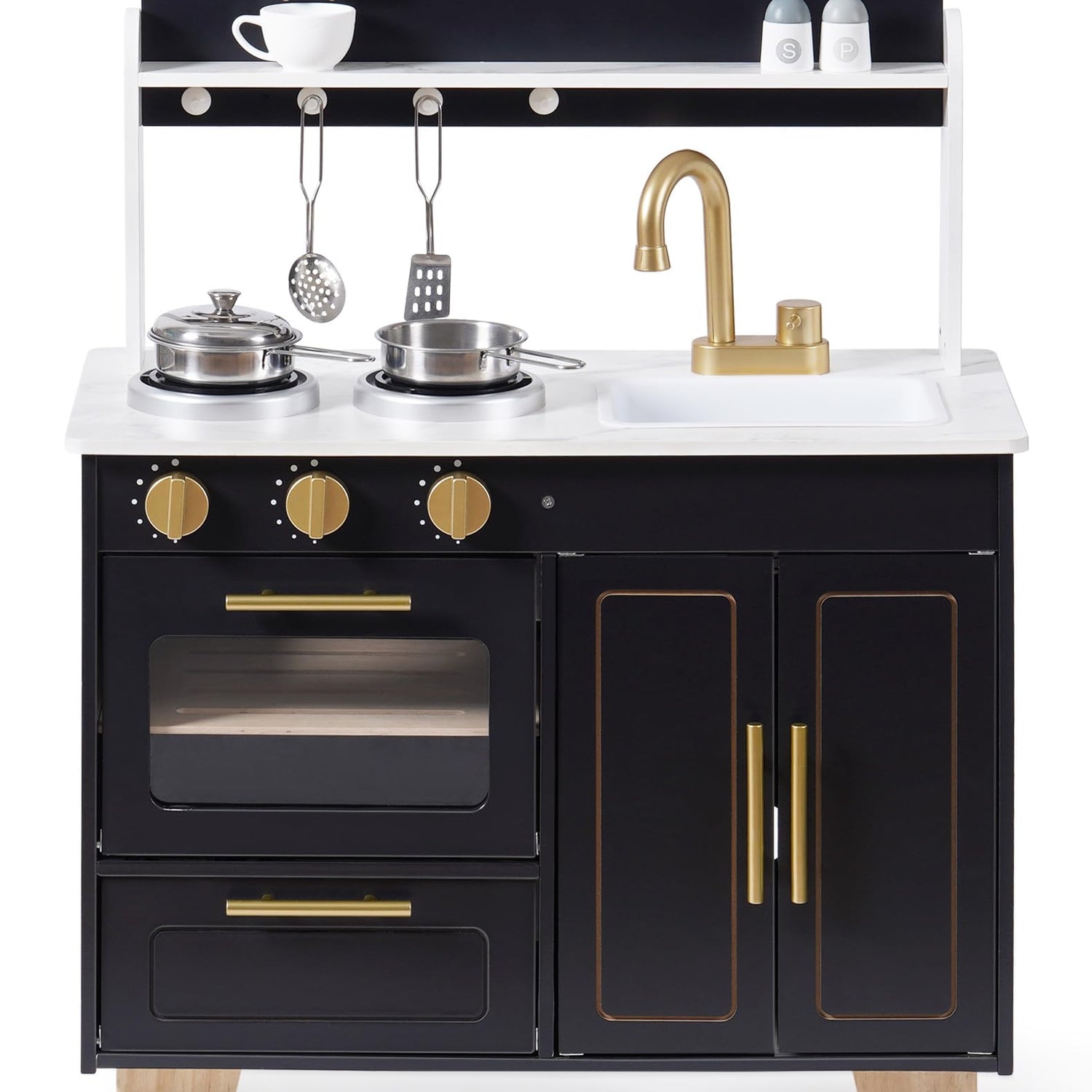 - 【Elegant Marble-Style Design】 This ROBUD play kitchen set features a sleek black and gold marble-style design, bringing a touch of elegance to your child's playtime. The set includes a realistic stove, oven, and sink, mimicking the look of a real kitchen.