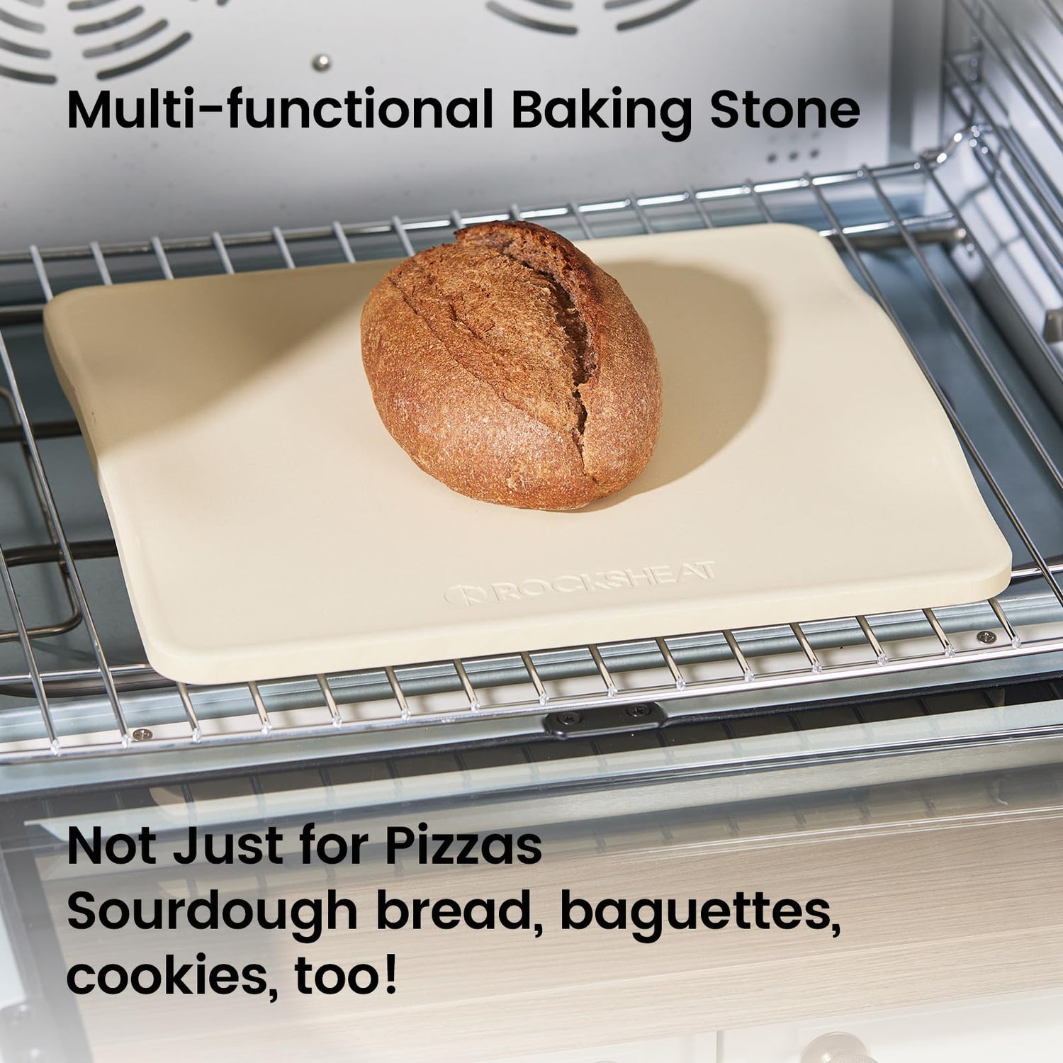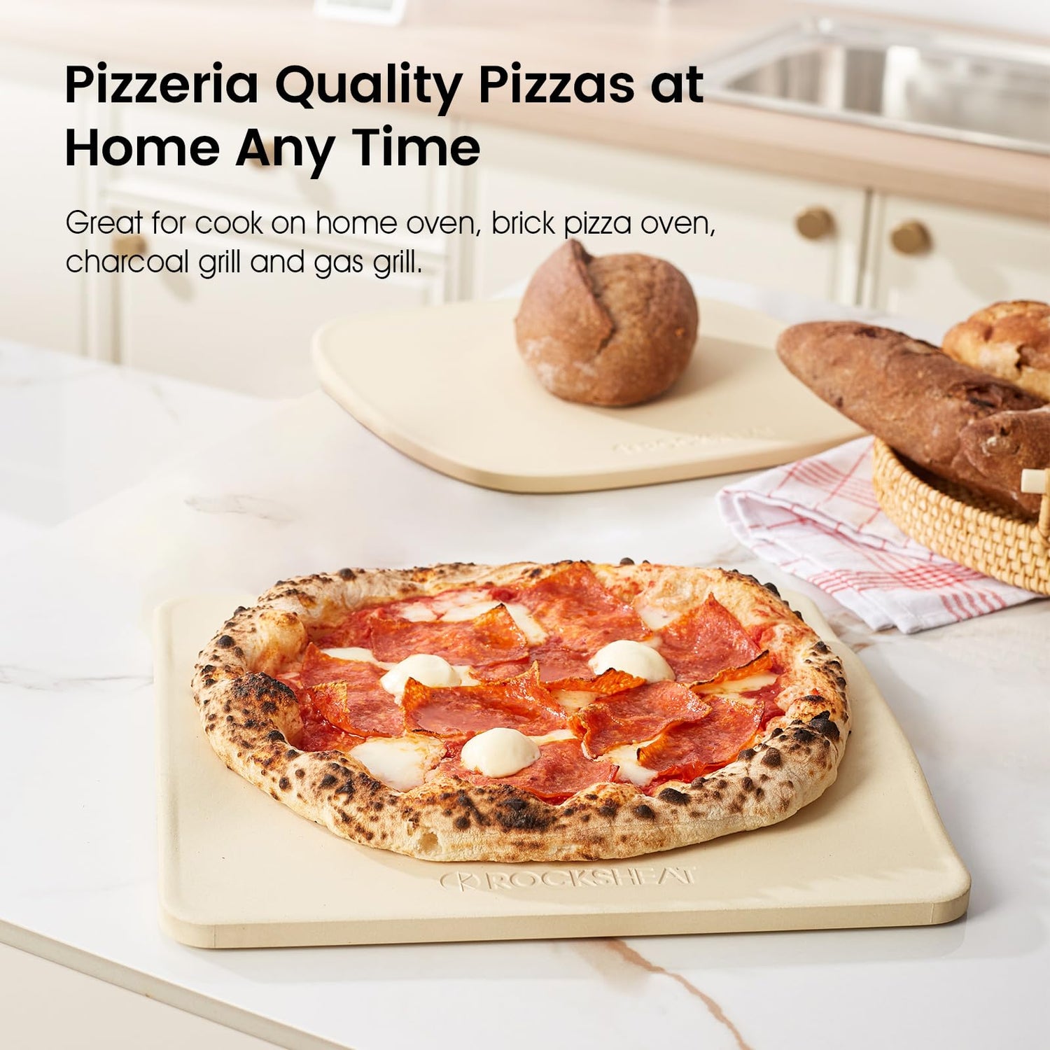 - PIZZERIA QUALITY PIZZAS AT HOME ANY TIME. You can easily get pizzeria quality pizza by using ROCKSHEAT pizza stone. In order for you to have an optimal experience of cooking, this cooking stone distributes heat evenly, provides you a crispy color crust that you always wanted. This baking stone is not only for making pizzas but can also be used to bake cookies, bread, biscuits and much more. You can even heat ready-made pizzas for better results.