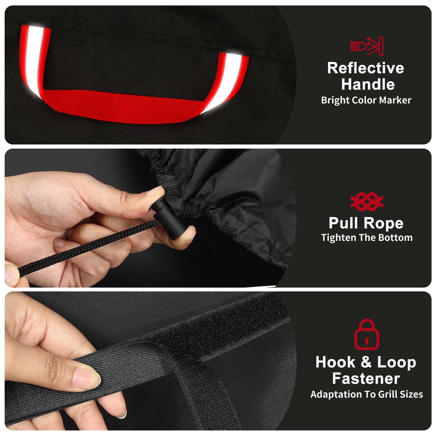 - Wind Resistant - The hook and loop fastener on both sides improves overall stability. The bottom features a drawstring tightening design, ensuring a snug fit around barbecue grills of various sizes to prevent the cover from being blown away