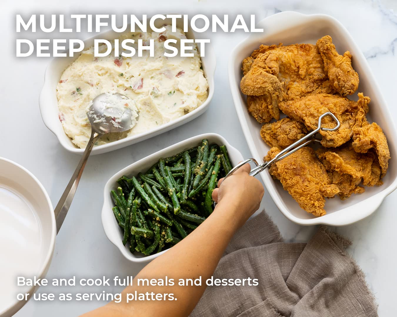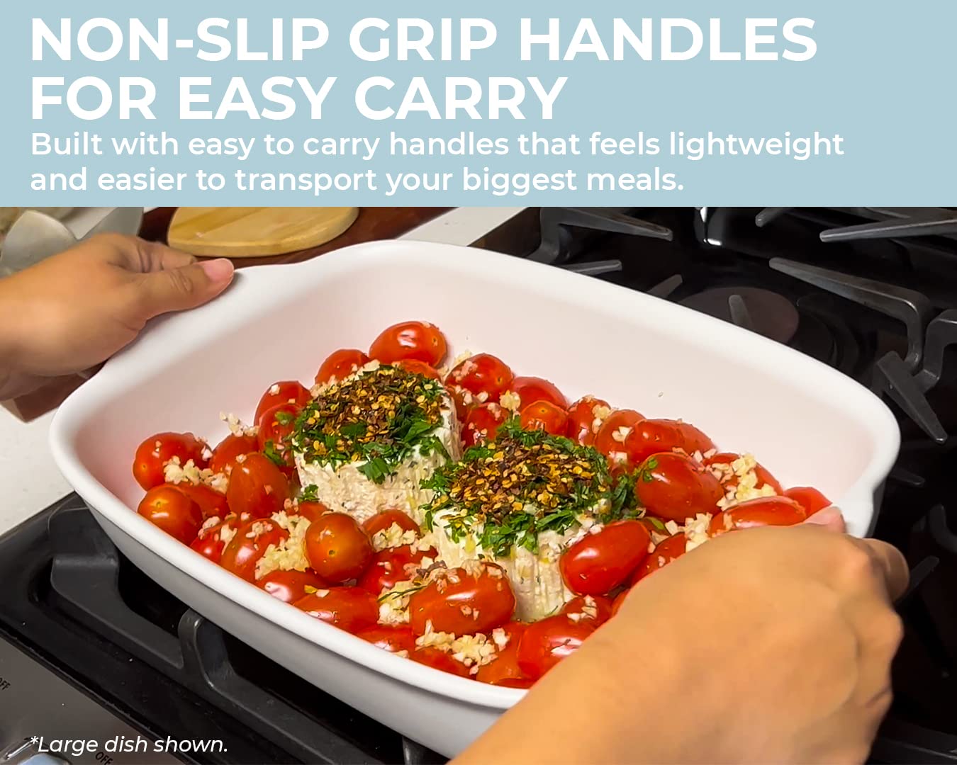 • The stunning and classic design of these oven to table serving dishes offer convenience while elevating your home dining experience. With a thoughtful design, from the non-slip handles that are easy to grip, a stackable design for easy storage that’s light to handle, a non-slip bottom, and rounded edges for ease of cleaning.