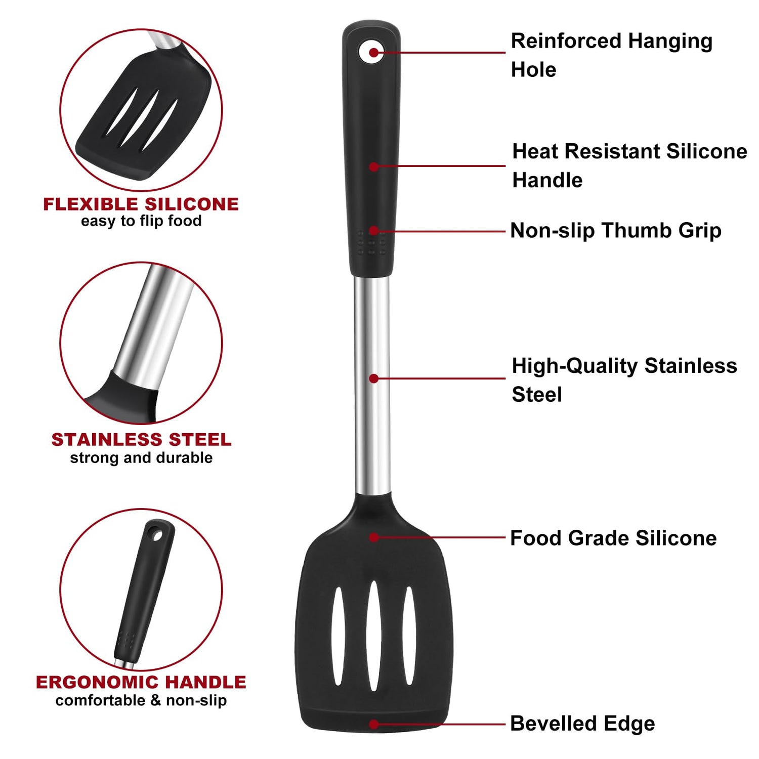 - 【Perfect Balance of Firm and Flexible】The cooking spatula bend when needed to bend! Stainless steel shaft increasing strength and durability, superior silicone head keeps the flex and without scratching to your delicate non-stick pots and pans.