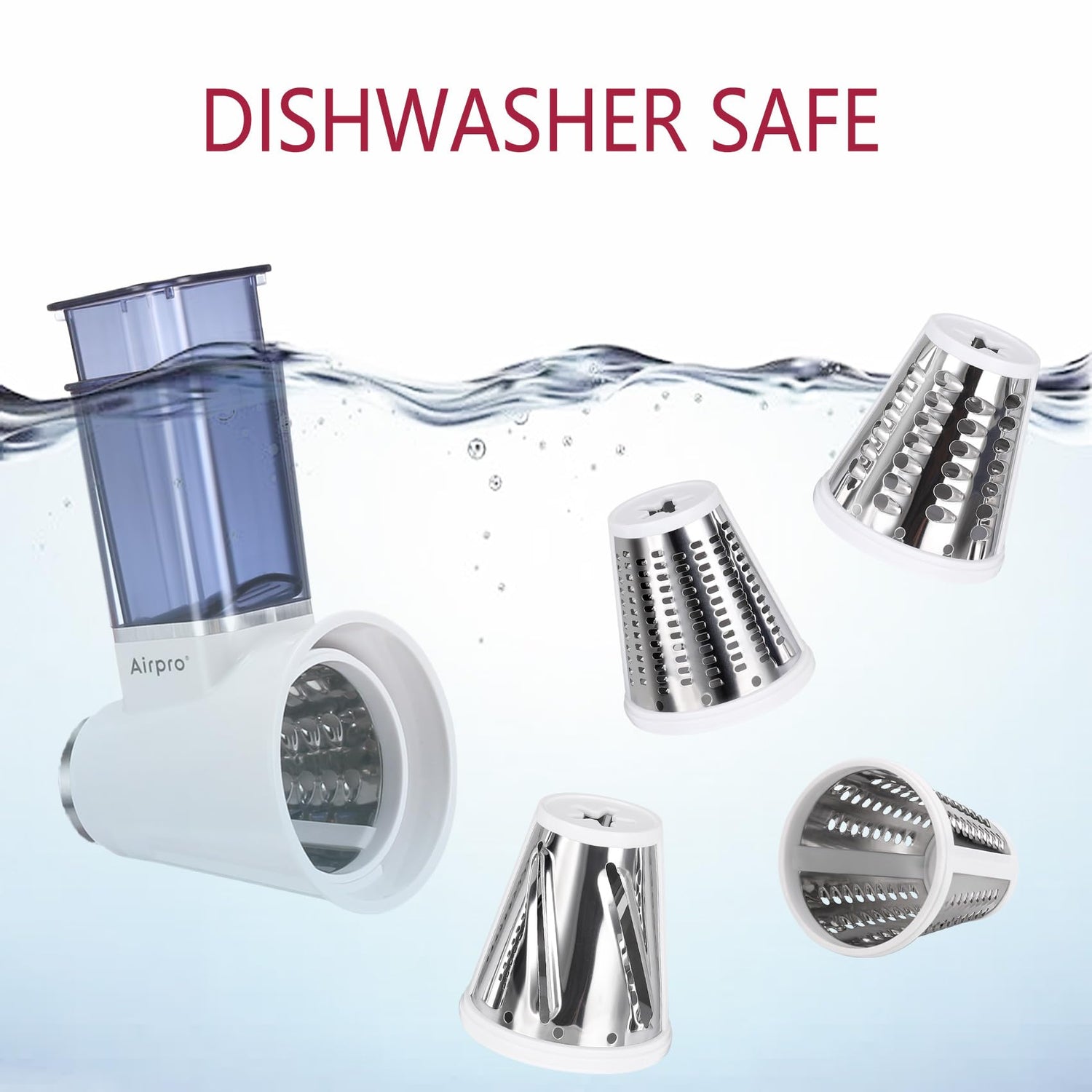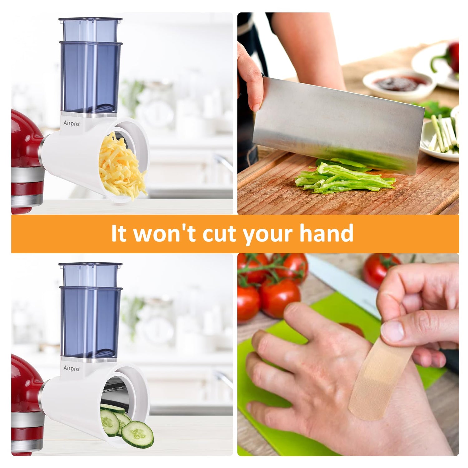 • 【Food-Grade Materials】 Airpro's newly upgraded Slicer Shredder Attachment for Kitchenaid Stand Mixer is made of Food-Grade stainless steel and plastic, and the blades have been upgraded from 3 to 4, making the cheese grater attachment for stand mixer even more versatile.All products are dishwasher safe!