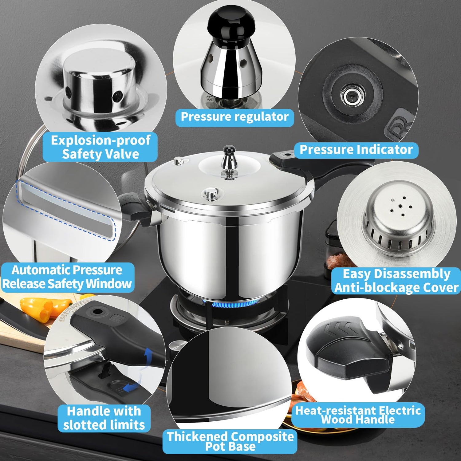 • ✅[Crafted from top-grade stainless steel and durability]-Our stainless steel pressure cooker guarantees food safety and prevents any harmful reactions with your ingredients. Keep all the nutrients and flavors intact the healthier way! Our pressure cooker boasts quality stainless steel components and ergonomic handles for rust resistance and heat endurance.