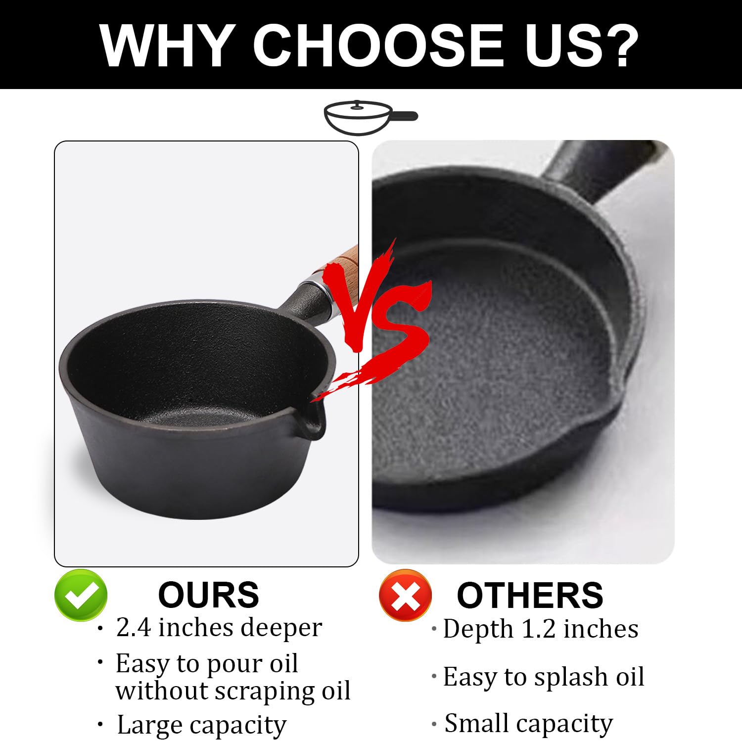 - Cast Iron Heat Retention: This pot is made of premium cast iron. It can withstand high temperatures and retain heat to keep the sauce or food delicious. With the heightened design, the pan can hold more sauce. With a wooden handle, can prevent scalding