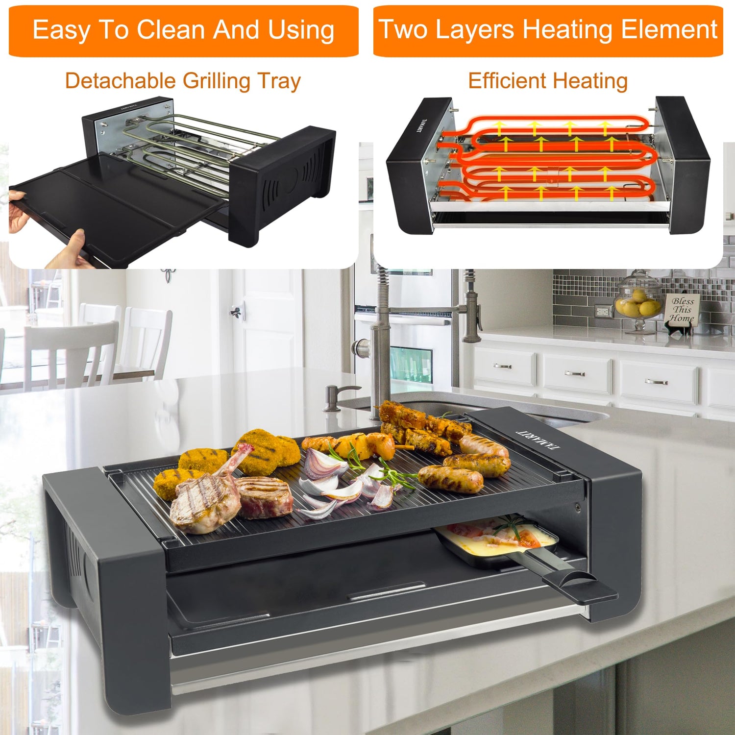• Customer Service: Tamarit portable electric indoor grill, conforms to the standard electricity in North America and Canada, 1450 W (1100 W+350 W), 120 V, 60 Hz, ETL Certified. Please let us know anytime if you have any problem about our grills, we will respond within 24 hours