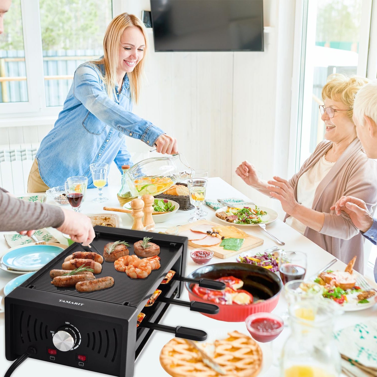 TAMARIT Raclette Party Grill Portable Indoor Electric Korean BBQ Grill 2 in 1 Raclette Table Grill with Ceramic Nonstick Coating Grill Plate 4 Pizza Pans 8 Cheese Trays Upper & Lower Heater,PFAS-No