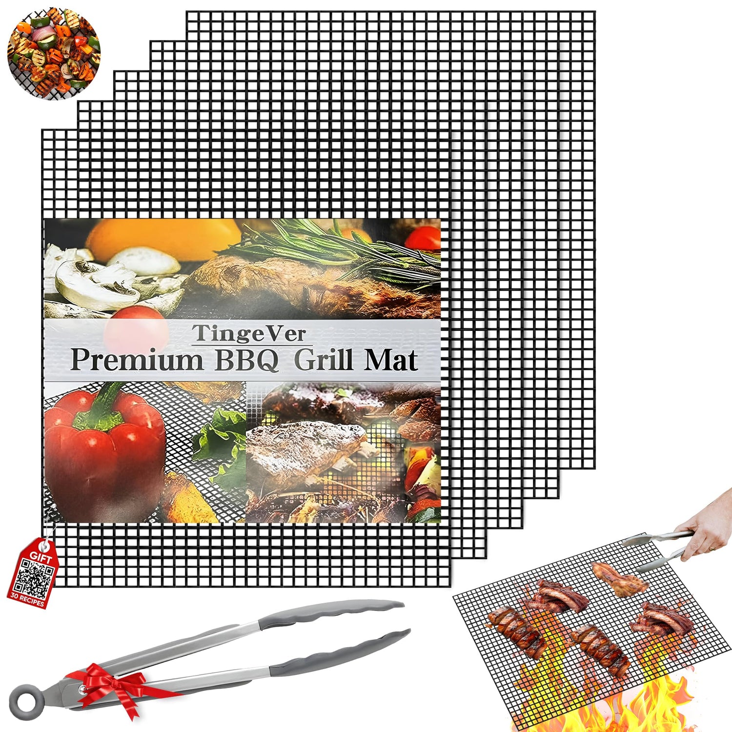 TingeVer - Set of 5 Non Stick BBQ Grill Mesh, Heavy Duty, Mesh Grill Mat + Tong + Code QR with 30 Recipes, Easy to Clean, Works on Gas, Charcoal, Electric Grill