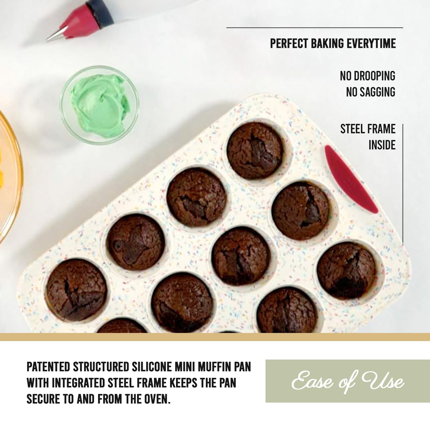 - Perfect baking every time; our fun confetti muffin pan combines the stability of metal bakeware with the flexibility, nonstick performance and quick cleanup of silicone