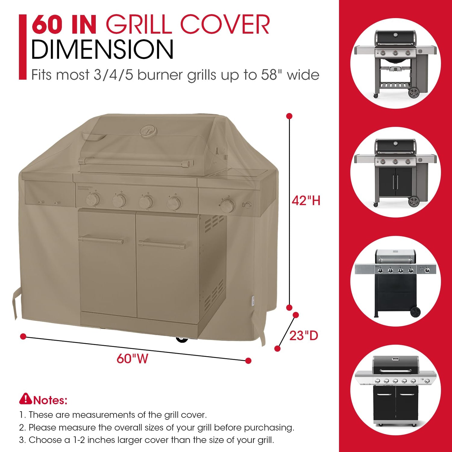 - 60 Inch Grill Cover Dimension: Measures 60"W x 23"D x 42"H, compatible with most brands of 3-5 burners grills in width from 54" to 58", like Weber, Char-broil, Nexgrill, Royal Gourmet, Even Embers, Expert, etc. Please Measure your grill before purchasing