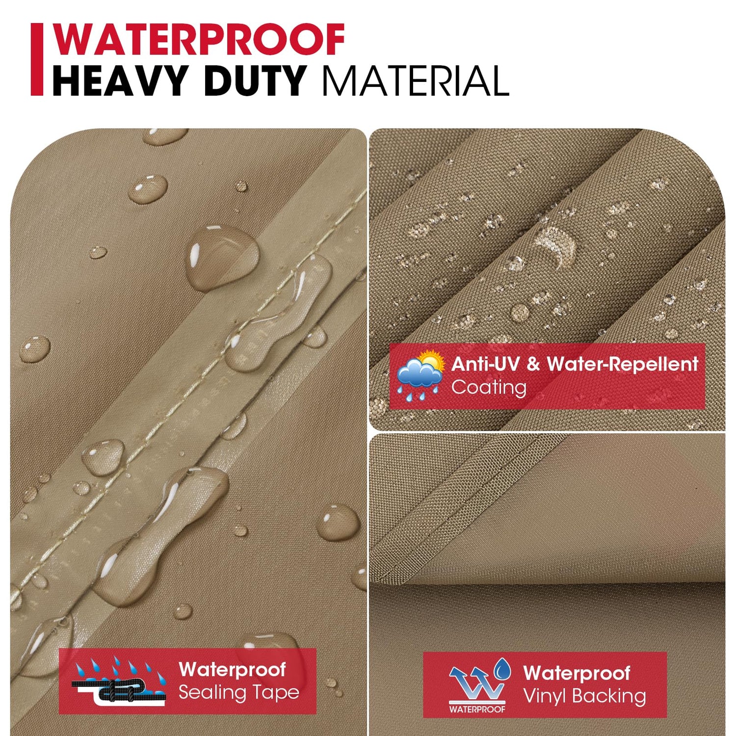 - Handles and Straps: The handles allow you to fit or remove the bbq grill cover with ease; they can also serve for hanging and storage conveniently. The fastening straps prevent your thick barbecue cover from getting blown away on windy days. (Tips: this taupe cover is without air vent)